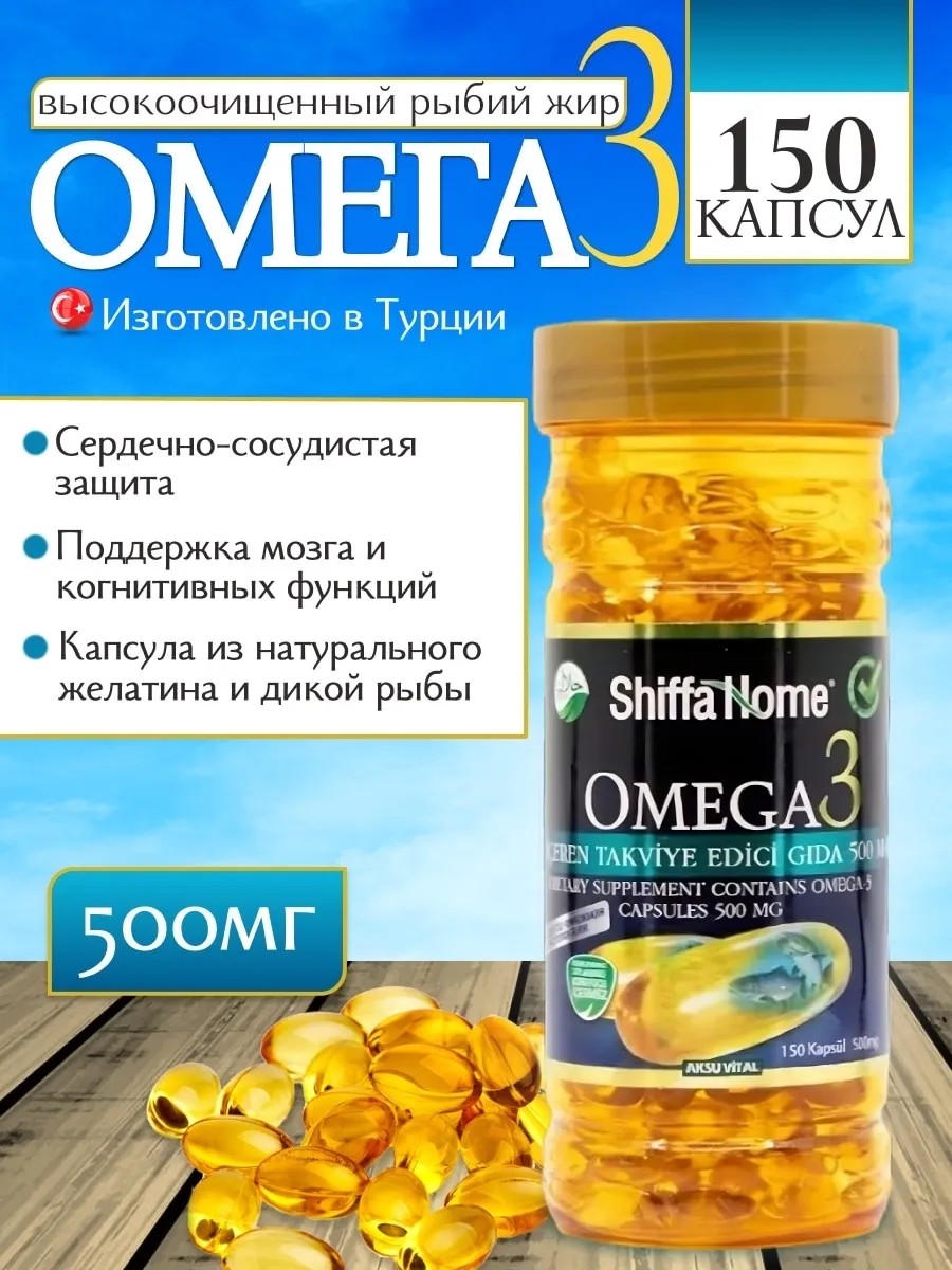 Омега витамин от турецкого бренда Shiffa Home, в упаковке витамины 150 капсул это 100% премиум препарат Omega 3 животного происхождения из печени рыбы, имеющие сертификат Халал. Состав чистый рыбий жир с добавлением EPA и DHA. 4 капсулы содержат: рыбий жир и омега3. Омега 3 6 предупреждает развитие сердечно-сосудистых заболеваний, снижает количество холестерина в крови, уменьшает и снижают тромбообразование, препятствует возникновению и развитию аритмии. Кислоты снижают риск развития диабета. Часто омега 3 6 9 назначается при лечении туберкулеза, анемии, куриной слепоты и для их профилактики. Кроме того, регулярный его прием значительно улучшает мозговую деятельность, а также насыщает организм витаминами группы A и D, что благотворно влияет на состояние кожи, волос и ногтей. Применение: Рекомендованная норма для взрослых по 2 капсулы 2 раза в день во время еды. Витаминный комплекс для женского здоровья для иммунитета и от выпадения волос. Это одна из самых базовых добавок для здорового и активного образа жизни в любом возрасте. Омега 3 для детей поможет улучшить их общее состояние здоровья. Сочетайте приём с другими добавками: с хондропротекторами люкозамина хондроитина для здоровья суставов и связок, А с витамином д для укрепления иммунитета. Без вкуса и запаха премиального качества укрепляет и мужское и детское здоровье, питает суставы и связки, кости и кожу, ногти а также мозг и глаза, поддержка при депрессии и выпадении волос. При похудении поможет в росте энергии днем. Этот БАД идеальный подарок маме и папе, сыну и дочке, бабушке или дедушке можно другу и подруге коллеге для занятий спортом. Морская океаническая омега добытая из печени трески и лосося, разбавленная жидким коллагеном и пищевыми добавками хлорофилла. Это отличные эффективные спортивные мультивитамины. Натуральный состав пищевой добавки: рыбий жир: деионизированная вода, желатин бычий, глицерин. Не следует превышать рекомендуемую дозировку. Не является заменой обычного питания. Не применять в лечебных целях. Перед применением во время беременности, кормления грудью, приема препаратов и при наличии каких-либо заболеваний или при применении антикоагулянтов следует проконсультироваться с врачом. Рекомендуемая суточная доза ЭПК и ДГК должна составлять не менее 250 мг в день, а ежедневное потребление не должно превышать 3 г.