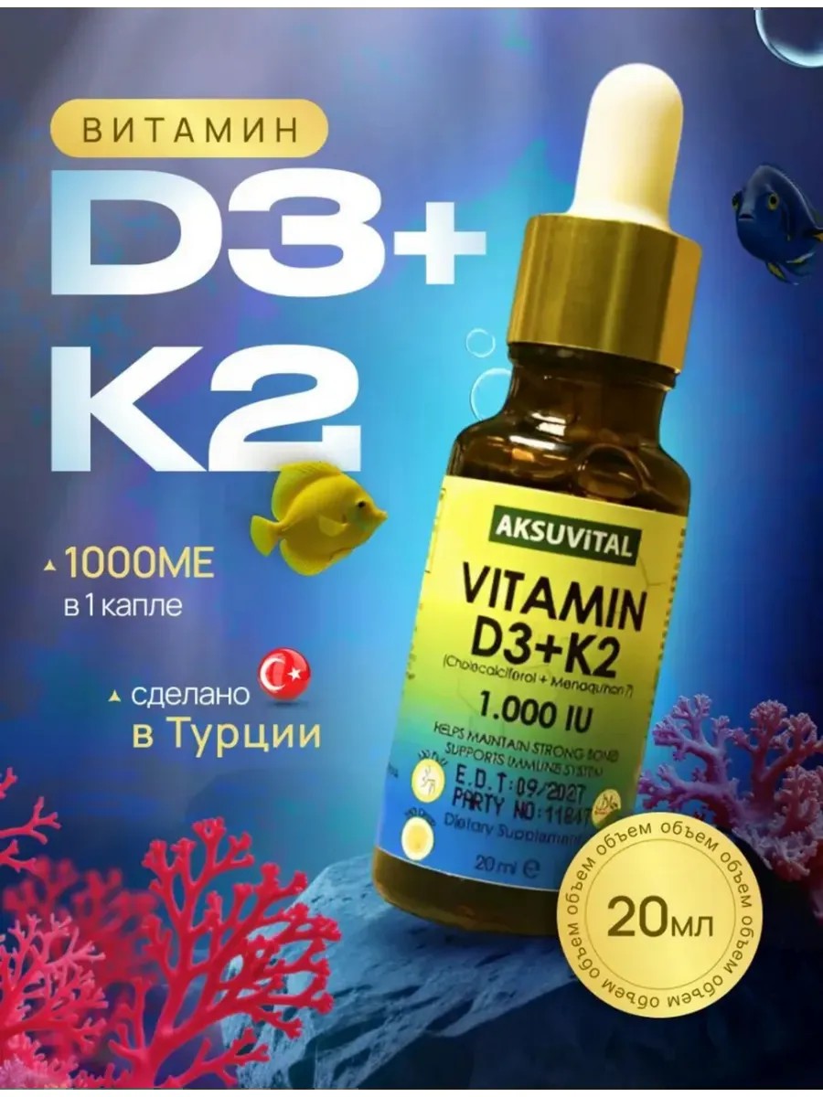 Vitamin D3K2 1000 МЕ является жирорастворимым, выполняющим важные функции в организме человека. С возрастом мы начинаем испытывать трудности с выработкой и усвоением этого вещества. Вот почему биологические добавки нужны для поддержания хорошего здоровья. Играет особую роль в регуляции фосфора, магния и цинка. С помощью K2 минерал из крови направляется непосредственно в костную ткань, содействует укреплению костей и зубов. Насыщает клетки энергией, нормализует уровень холестерина, повышает иммунитет и способствует улучшению работы сердца и сосудов. Препарат на основе качественного оливкового масла содержит натуральный D3 в высокой дозировке, который особенно хорошо усваивается благодаря содержанию кальция в активной форме менахинона-7 (МК-7). Работая вместе, эти компоненты идеально сочетаются, восполняют дефициты и обеспечивают превосходную поддержку для опорно-двигательного аппарата и сердечно-сосудистой системы. Помогает восстанавливать защитные оболочки нервов. Это настоящий антистресс, стимулирует выделение коллагена. Это особенно необходимо для женщин, так как приводят в норму гормоны, улучшают состояние кожи лица, волос и ногтей. Можно принимать как самостоятельно, так и добавляя в еду или напитки. Жидкость намного удобнее, чем в таблетках, капсулах или порошке. Подходит для взрослых и детей. В одном флаконе объема 20 мл находится 400 порций. Одна доза = 1 капля. Производится по стандартам GMP на высокоточном оборудовании, где проходит тщательная очистка сырья и правильное дозирование. Соответствует международным требованиям качества, относится к продукции премиум сегмента.