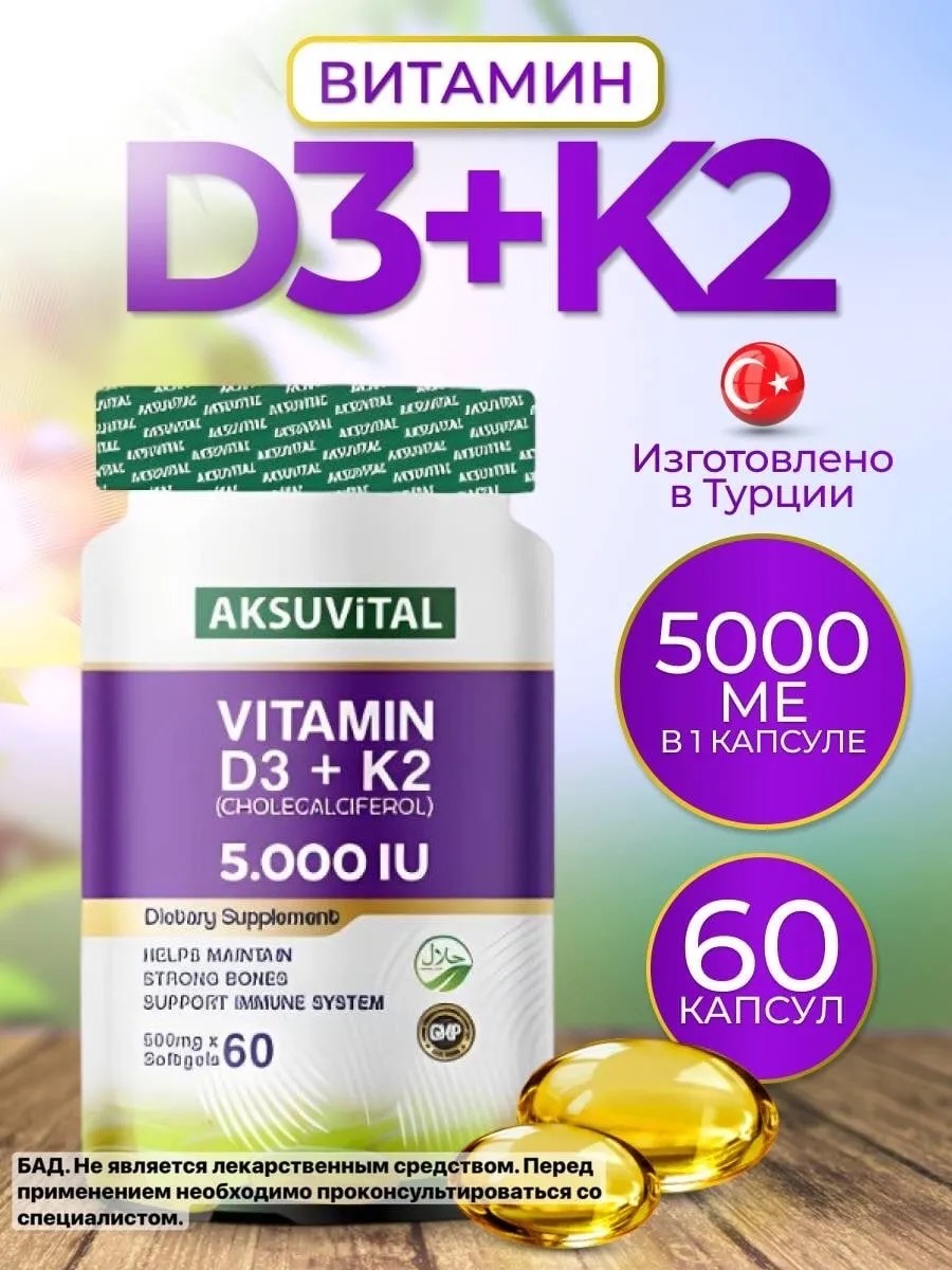 Витамин Д относится к группе Витаминов и Бадов. Д3 К2 в форме капсул имеет важные функции в организме человека. Вся продукция турецкого бренда Aksu Vital, в том числе и препарат витаминный комплекс D3 K2, не содержат вредных веществ и добавок, произведены без красителей, подсластителей и искусственных ароматизаторов, а также без добавления сахара. Бад с Vitamin Д3 с К2 предлагает удобное и безопасное использование для взрослых в виде удобных для глотания капсул. D уменьшает риск нарушения осанки из-за мышечной слабости. Пищевая добавка д3к2 способствует сохранению нормальных костей. Вит д3 к2 нормализует уровень кальция в крови и является помощником для поддержания естественной функции мышц. Эффективный комплекс для защиты ваших зубов. Помогает всасыванию и употреблению кальция и фосфора и функционированию иммунной системы. Играет важную роль в делении клеток. D и К в составе продукта для сохранения костей. Новый натуральный и эффективный комплекс для поддержки работы мозга представляет пищевую добавку. Оригинальный препарат, имеющий сертификат качества и мировое имя. D3 + K2 Vitamin это легкоусвояемая форма D и K. Комплекс микроэлементов необходим для усвоения кальция, укрепления костей, здоровья зубов, сосудов и сердца. Витамин д3 к2 ме произведен с применением масла МСТ, которое является источником жирных кислот, необходимых для нормальной работы всех систем организма. Ежедневный прием поможет восполнить запас необходимых витаминов, укрепить здоровье и чувствовать себя бодрее. Витамин солнца помогает усвоить кальций и фосфор и укрепляет кости, повышает жизненный тонус, улучшает настроение. K дополняет Д, обеспечивая правильное взаимодействие с кальцием. Также микроэлемент активирует синтез белков, которые поддерживают работу сердца, укрепляют нервную систему участвует в обмене веществ и поддерживает работу почек. Рекомендации по использованию: употреблять по 1 капсуле раз в 3 дня. В одной капле содержится