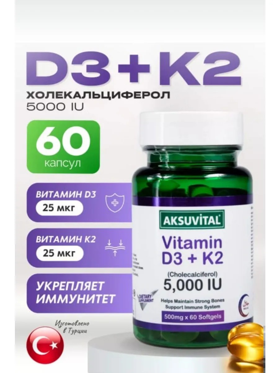Витамин Д с витамином К 5000ед холекальциферол Shiffa Home - этот уникальный комплекс, который станет незаменимым помощником для поддержания здоровья и иммунитета вашего организма. Расскажем, почему он так ценен и какие выгоды он приносит. Бады D3 известны своими многочисленными положительными свойствами. Он является нужным элементом для крепких костей, зубов и мышц, а также улучшения работы иммунной системы. Без этого виатмина наш организм не может правильно усваивать кальций, что приводит к ряду проблем, например, остеопороз. Кроме того, D улучшает состояние кожи, волос и ногтей, делая их более крепкими и здоровыми. Комплекс применяется для функционирования щитовидной железы и нормальной свертываемости крови. Бад будет эффективен для женщин и мужчин в любом возрасте. Для детей и подростков он помогает формировать рост и развитие скелета, улучшает память и внимание. Основная функция состоит в регуляции кальция и фосфора. Кроме того, он способствует синтезу белков, необходимых для укрепления мышц и нервных клеток. Необходим для беременных и кормящих по рекомендации специалиста. Перед применением, проконсультируетесь с врачом, чтобы определить правильную дозировку именно для вас. Турецкое качество отличается высокой биодоступностью и быстрым действием. Vitamin предназначен для взрослых, подростков. Следи за своим здоровьем вместе с лабораторией Aksu vital!
