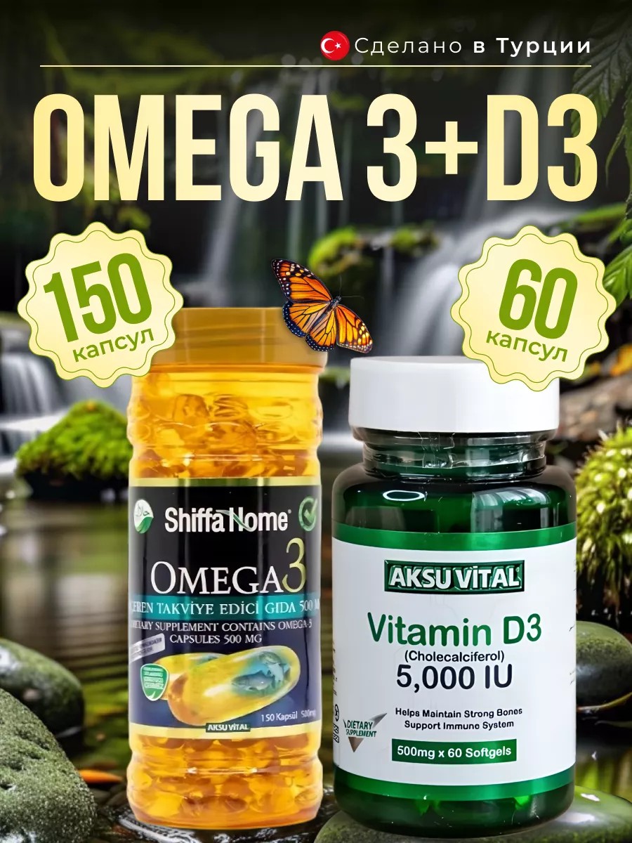 Витамин д3 5000 участвует в работе всех органов и систем: регулирует обмен кальция и фосфора. БАД D3 витаминный комплекс от Shiffa Home, который помогает нормализовать свертываемость крови и улучшает чувствительность клеток к инсулину. Укрепляет иммунную систему. Действующий компонент добавки останавливает рост онкологических новообразований, способствует борьбе с воспалительными процессами. Д3 улучшает состояние кожи, волос и ногтей, делая их более крепкими и здоровыми. Пищевая добавка применяется для функционирования щитовидной железы и нормальной свертываемости крови. Она помогает восстанавливать нервные окончания, участвует в регуляции кровяного давления и сердцебиения. Бады будут эффективны для женщин и мужчин в любом возрасте. Для детей и подростков он помогает формировать рост и развитие, улучшает память и внимание. Для женщин помогает сбалансировать гормональный фон и предотвратить остеопороз в период менопаузы а также снизить риск развития атеросклероза и сердечных заболеваний чем улучшает состояние ногтей и волос или кожи. Витамин д3 полезен и для мужчин: нормализует концентрацию тестостерона и увеличение объема мышц и развитие мышечной силы. Для детей и подростков он помогает формировать рост и развитие, улучшает память и внимание. Омега витамин от турецкого бренда Shiffa Home, в упаковке витамины 150 капсул это 100% премиум препарат Omega 3 животного происхождения из печени рыбы, имеющие сертификат Халал. Состав чистый рыбий жир с добавлением EPA и DHA. 4 капсулы содержат: рыбий жир и омега3. Предупреждает развитие сердечно-сосудистых заболеваний, снижает количество холестерина в крови, уменьшает и снижают тромбообразование, препятствует возникновению и развитию аритмии. Кислоты снижают риск развития диабета. Часто препарат назначается при лечении туберкулеза, анемии, куриной слепоты и для их профилактики. Кроме того, регулярный его прием значительно улучшает мозговую деятельность, а также насыщает организм витаминами группы A и D, что благотворно влияет на состояние кожи, волос и ногтей. Витаминный комплекс Омега3 + витамин Д - уникальный тандем, который позволяет данным микроэлементам в несколько раз усилить действия друг друга, поэтому принимать их вместе не только можно, но и рекомендовано многими врачами.