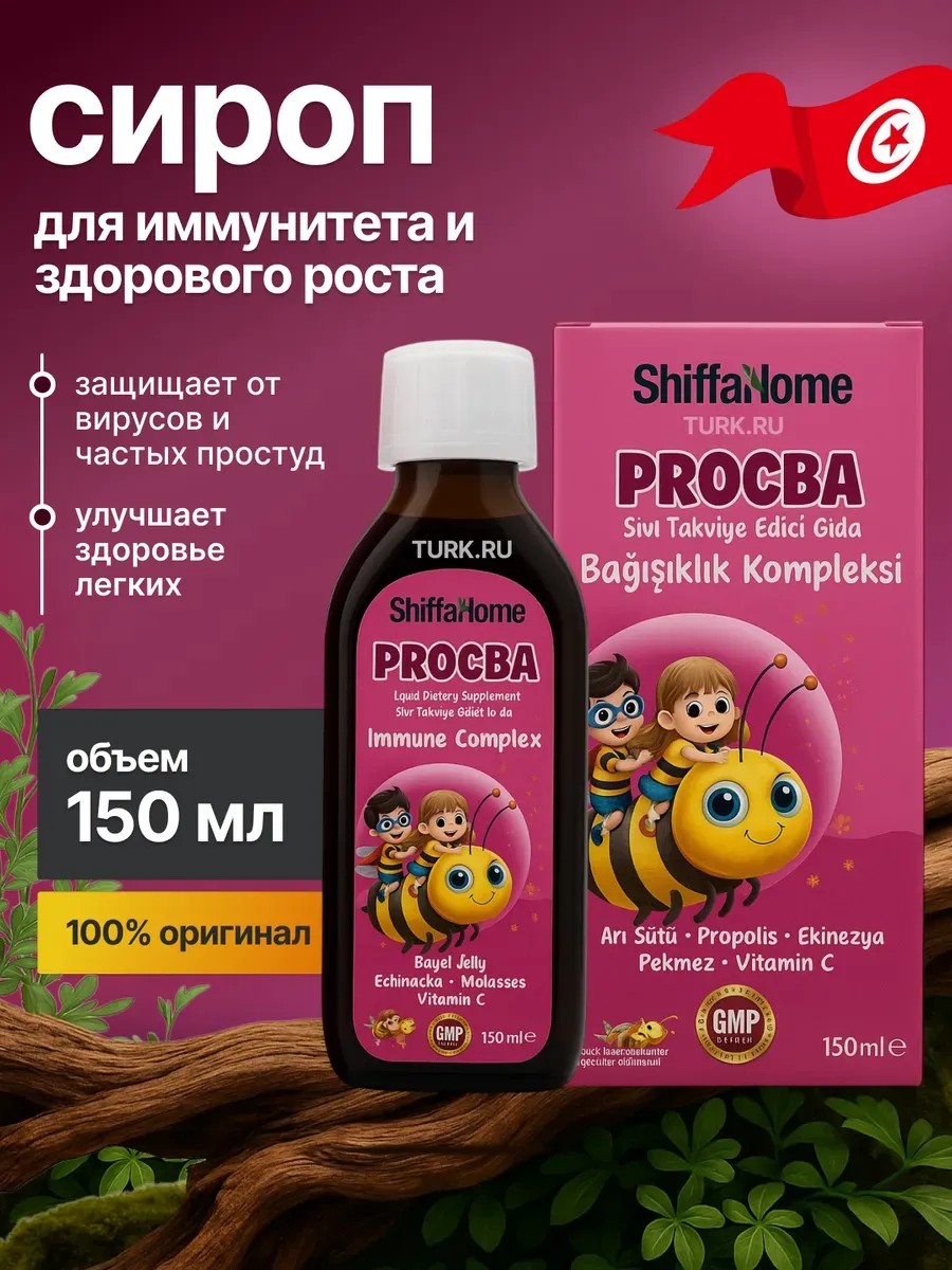 Мультивитаминный комплекс от турецкого бренда shiffaHome- идеальное решение для поддержания здоровья всей семьи. В качестве пищевой добавки принимайте 2 полные чайные ложки ежедневно для детей старше 3 лет с пищей или по указанию врача или фармацевта. Витамин А способствует нормальному росту и развитию у детей, поддерживая восстановление тканей и костей, а также хорошее зрение. Витамин С помогает образованию соединительной ткани, улучшает состояние кожи и мышечной ткани, повышает иммунитет. Витамин D3 укрепляет кости и зубы, способствуя усвоению минералов, а витамин Е укрепляет иммунную систему. Цинк поддерживает функции иммунитета и метаболизм. Этот комплекс включает витамины B2, B3, B5, B6 и B12. Витамины группы B нормализуют состояние нервной системы, улучшают работу мозга и когнитивные функции, иммунитет и пищеварение, повышают энергию, улучшают настроение. Йод выполняет важнейшие функции в организме - регулирует деятельность щитовидной железы, стимулирует иммунную систему и нормализует работу центральной нервной системы. Для чувствительных потребителей shiffahome procba легко смешать с соком или коктейлем. Жидкая форма выпуска продукта делает использование бада легким и приятным для малышей, в отличие от таблеток или капсул.