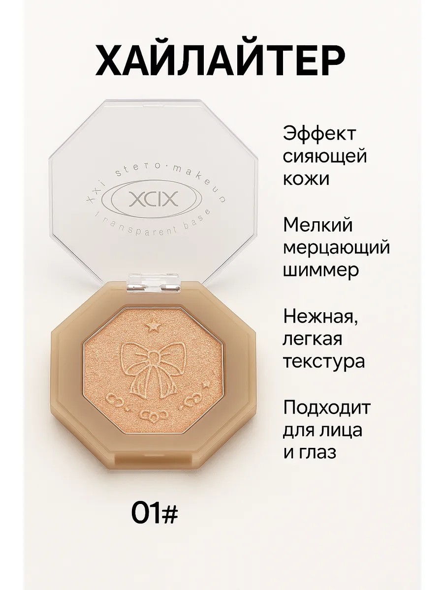 Хайлайтер компактный оттенка 01# – это универсальное косметическое средство для создания безупречного сияющего макияжа.. Благодаря нежной текстуре и мелкодисперсному шиммеру продукт легко наносится и равномерно распределяется по коже, подчёркивая её естественную красоту. Хайлайтер предназначен для использования на лице и теле: им можно выделять скулы, спинку носа, галочку над губой, ключицы или зону декольте. Эффект «стеклянной кожи» создаёт модное влажное сияние, придаёт свежесть и ухоженный вид, делая макияж более выразительным.