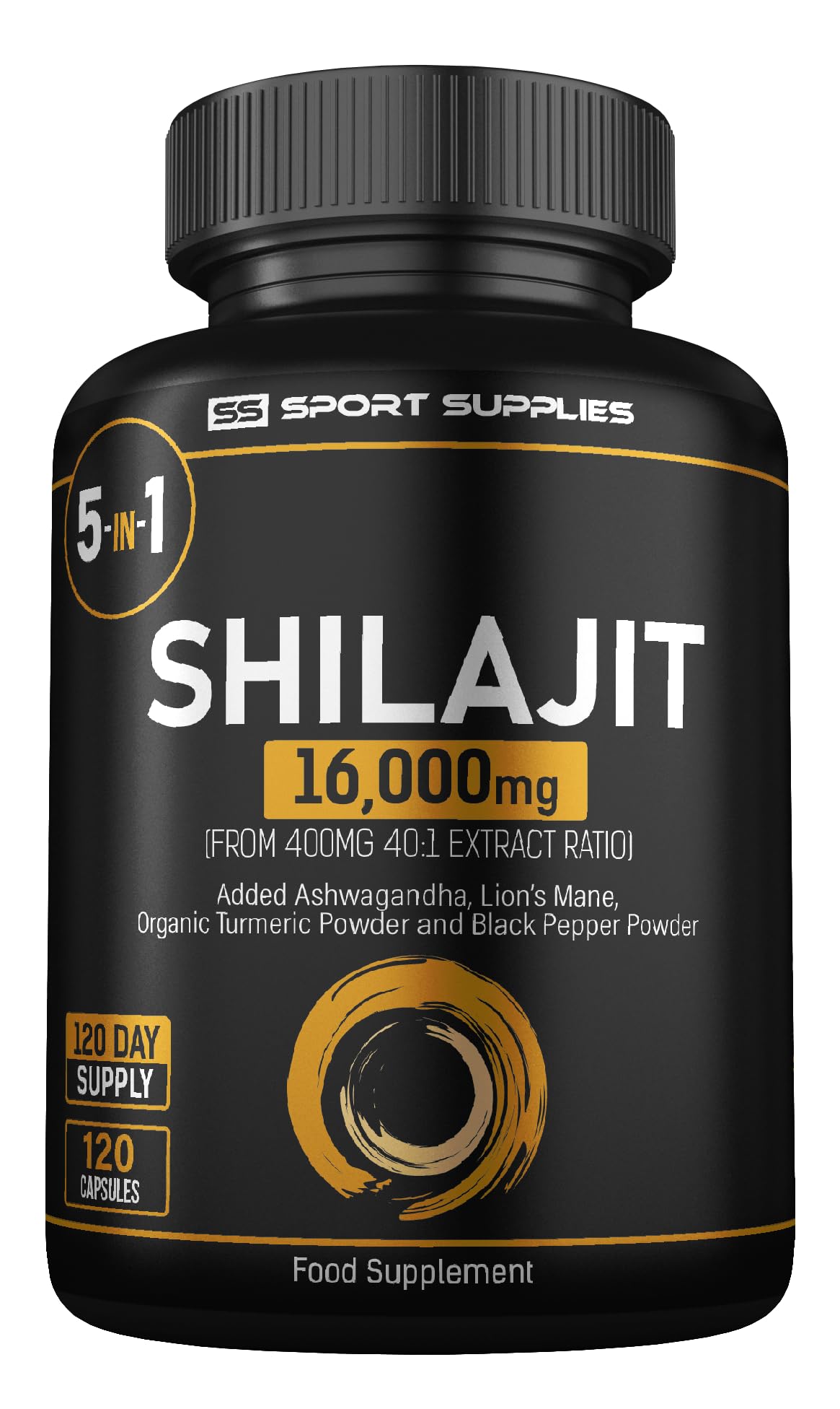 Introducing our Shilajit 5-in-1 SS Sport Supplies Formula, a comprehensive combination of Shilajit Pure Himalayan Extract, Ashwagandha, Lion’s Mane, Turmeric and black pepper, enriched with 5 potent ingredients. Experience the power in one convenient formula. These Himalayan Shilajit 5-in-1 capsules provide a great alternative to Shilajit resin with no taste. INGREDIENTS Shilajit 60% Fulvic Acid 20:1 Extract, Organic Ashwagandha Powder, Organic Turmeric Powder, Lion’s Mane Mushroom 20:1 Extract (50% Polysaccarides), Organic Black Pepper Powder, Vegetable Capsule Shell (HydroxyPropylMethylCellulose).Why Choose Our Product - Firstly, our capsules have no binding/bulking agents or fillers compared to tablets or other capsule products. Some products have brown rice flour to bulk out their capsules, they do this because they have little active ingredient. Our capsules have 400mg Shilajit (equivalent to 16,000mg), 100mg Ashwagandha, 100mg turmeric, 100mg lion’s mane (equivalent to 2,000mg) and 10mg of black pepper. Yes, all this in one convenient capsule for a 120 day supply. Our advanced formula of Natural Shilajit Capsules are designed for both men and women. SS Sport Supplies presents a potent 5-in-1 formula. Our capsules have a potent 400mg of pure Himalayan extract 40:1 ration per capsule. That means, 16-grams of Himalayan Shilajit was used to make a concentrated 40:1 extract. Introducing our Shilajit 5-in-1 SS Sport Supplies Formula, a comprehensive combination of Shilajit Pure Himalayan Extract, Ashwagandha, Lion’s Mane, Turmeric and black pepper, enriched with 5 potent ingredients. Experience the power in one convenient formula. These Himalayan Shilajit 5-in-1 capsules provide a great alternative to Shilajit resin with no taste.