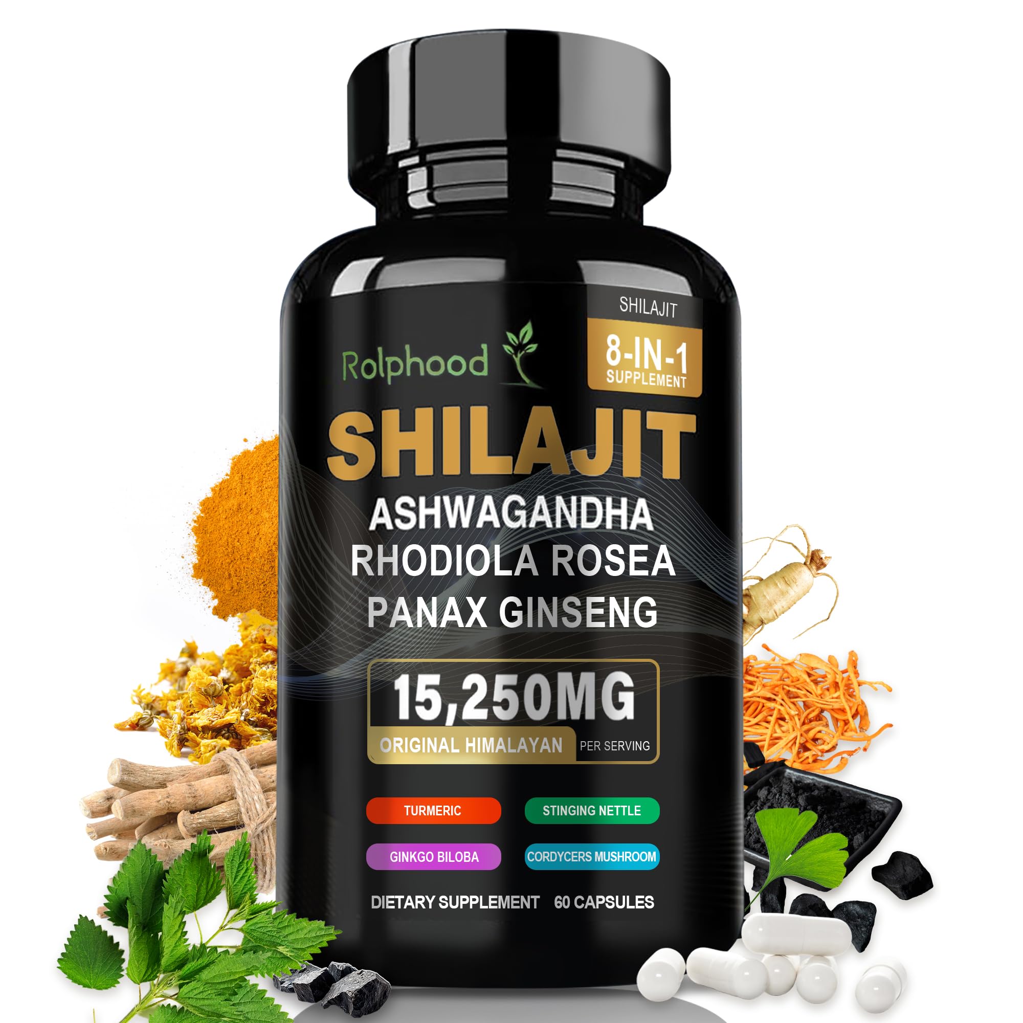 Convenient Supply:Organic shilajit Supplement providing 60 capsules.Take 1 or 2 cap once a day before during after meal.We've gathered the essence in a bottle that can be taken on the go, making it easy to take control of your health. Pure Quality: Our shilajit supplements are prioritize purity and quality. Carefully harvested and processed to ensure its natural integrity.Sugar-free, gluten-free, dairy-free and soy-free. Benefits: Rolphood shilajit for Men Women, Tailored for both men and women, this bundle delivers a diverse range of nutrients, adaptogens, and minerals . Stay Healthy Be Your Own Queen. Shilajit Pure Himalayan Organic:Shilajit Capsules sourced from the over 18,000 feet tall of the Himalayas.15250 MG per serving.These shilajit ashwagandha capsules provide an alternative to shilajit resin, shilajit gummies, and ashwagandha gummies. Shilajit for Men Women: 8-IN-I combination of Shilajit Pure Himalayan,our Rolphood Shilajit enriched with 8 potent ingredients, experience the holistic benefits in one convenient supplement.