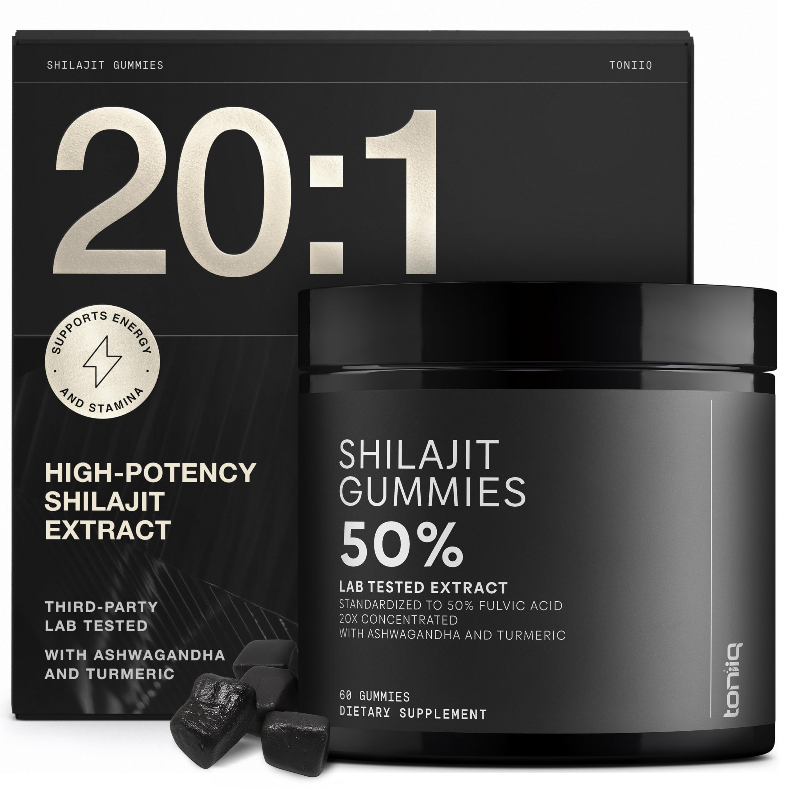 Individually Tested for Potency & Purity: Each batch undergoes rigorous third-party testing to ensure correct standardized levels of active compounds and freedom from contaminants. Setting a New Standard for Purity: Every batch is tested for quality and purity both during and after manufacturing. Toniiq products are produced in a GMP-certified, state-of-the-art facility in the USA. Enhanced with Turmeric & Ashwagandha: Our advanced formula includes high-potency 10:1 Turmeric (1,050mg equivalent) and 10:1 Ashwagandha (1,700mg equivalent) to support overall wellness and vitality. Ultra High Strength 8750mg Equivalent: Each serving provides a powerful 8750mg equivalent of Himalayan-sourced Shilajit extract, delivering one of the highest potency formulas on the market. 50% Fulvic Acid – One of the Highest Purity Levels Available: Our Shilajit gummies feature an industry-leading 50% fulvic acid content, ensuring a highly concentrated and potent formula.