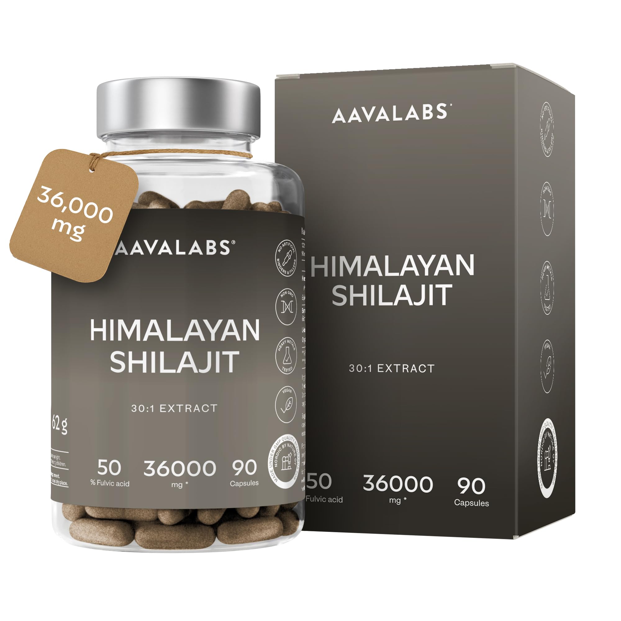 THE AAVALABS PROMISE: Our goal is to help you live each day to the fullest, both physically and mentally. If our pure natural shilajit supplement doesn't meet your needs, please contact us. Our customer service team is always ready to answer your questions in multiple languages. Our supplement is tested for heavy metals and is preservative-free. Harness the natural power of the Himalayas to enhance your daily well-being with AAVALABS. DISCOVER THE POWER OF NATURE: Incorporate the pure Himalayan shilajit supplement in softgel form with fulvic acid into your daily routine. Compared to pure shilajit resin or tablets, pure shilajit in softgel form is a convenient and safe format, ensuring maximum purity and effectiveness. Our pure Himalayan shilajit formula is vegan, GMO-free, gluten-free, lactose-free, and free of artificial additives. We recommend taking two softgels daily with water, preferably with meals. PHYSICAL AND MENTAL ENERGY INTEGRATOR: Natural shilajit for men and women is valued for its role in supporting vitality and overall well-being. Used for centuries as a natural remedy in Ayurvedic and Traditional Chinese Medicine, AAVALABS shilajit contains 50 fulvic acid, known for its nutritive properties, as well as a wealth of essential minerals and trace elements. NATURALLY SOURCED SHILAJIT CAPSULES: Himalayan shilajit resin forms naturally among the rocks of the Himalayas. It is harvested in the summer, when the sun's heat causes it to emerge. After harvesting, it is purified using traditional methods to preserve its characteristics, guaranteeing a completely natural final product, free of chemical additives. The high purity of our shilajit extract capsules makes it an authentic and genuine supplement. HIGH-QUALITY PURE SHILAJIT: Our formula contains 1200 mg of standardized 30:1 extract, equivalent to 36,000 mg of pure, natural, and safe Himalayan shilajit. Shilajit is renowned for its rich chemical composition, including nutrients and bioactive compounds such as fulvic and humic acids, as well as minerals in ionic form. These elements, derived from the plant's long decomposition process, make shilajit an ideal supplement for physical and mental energy.LA PROMESSE AAVALABS : Notre objectif est de vous aider à vivre pleinement chaque jour, physiquement et mentalement. Si notre complément de shilajit naturel pur ne vous satisfait pas, contactez-nous. Notre service client est toujours prêt à répondre à vos questions en plusieurs langues. Notre intégrateur est testé pour les métaux lourds et sans conservateurs. Profitez de la puissance naturelle de l'Himalaya pour améliorer votre bien-être quotidien avec AAVALABS. DÉCOUVREZ LE POUVOIR DE LA NATURE : Intégrez l'intégrateur pure himalayan shilajit en gelules avec de l'acide fulvique à votre routine quotidienne. Comparé à la résine de shilajit pure ou aux comprimés, le shilajit pur en gelules est un format pratique et sûr, assurant une pureté et une efficacité maximales. Notre formule de shilajit himalayen pur est végane, sans OGM, gluten, lactose ni additifs artificiels. Nous recommandons deux gélules par jour avec de l'eau, de préférence pendant les repas. INTEGRATEUR D'ÉNERGIE PHYSIQUE ET MENTALE : Le natural shilajit pour homme et femme est apprécié pour son rôle dans le soutien de la vitalité et du bien-être général. Utilisé depuis des siècles comme remède naturel en médecine ayurvédique et traditionnelle chinoise, le shilajit AAVALABS contient 50 d'acide fulvique, reconnu pour ses propriétés nutritives, ainsi qu'un grand nombre de minéraux et oligo-éléments essentiels. SHILAJIT GELULE D'ORIGINE NATURELLE : La résine de shilajit de l'Himalaya se forme naturellement entre les roches de l'Himalaya. Elle est récoltée en été, lorsque la chaleur du soleil la fait émerger. Après la collecte, elle est purifiée par des méthodes traditionnelles pour préserver ses caractéristiques, garantissant un produit final totalement naturel, sans additifs chimiques. La haute pureté de notre extrait de shilajit en gelules en fait un complément authentique et genuin. SHILAJIT PURE DE HAUTE QUALITÉ : Notre formule contient 1200 mg d'extrait standardisé 30:1, équivalent à 36 000 mg de pure shilajit Himalaya, naturel et sûr. Le shilajit est réputé pour sa composition chimique riche en nutriments et composés bioactifs comme les acides fulviques et humiques, ainsi qu'en minéraux sous forme ionique. Ces éléments, issus d'un long processus de décomposition des plantes, font du shilajit un complément idéal pour l'énergie physique et mentale.Shilajit Pure Himalaya 36000mg Extrait 30:1 50 Acide Fulviques Qualité Premium - Shilajite Energie et Immunité 100 Végétalien, Pur, Sans Additifs - 90 Pure Himalayan Shilajit Gélules