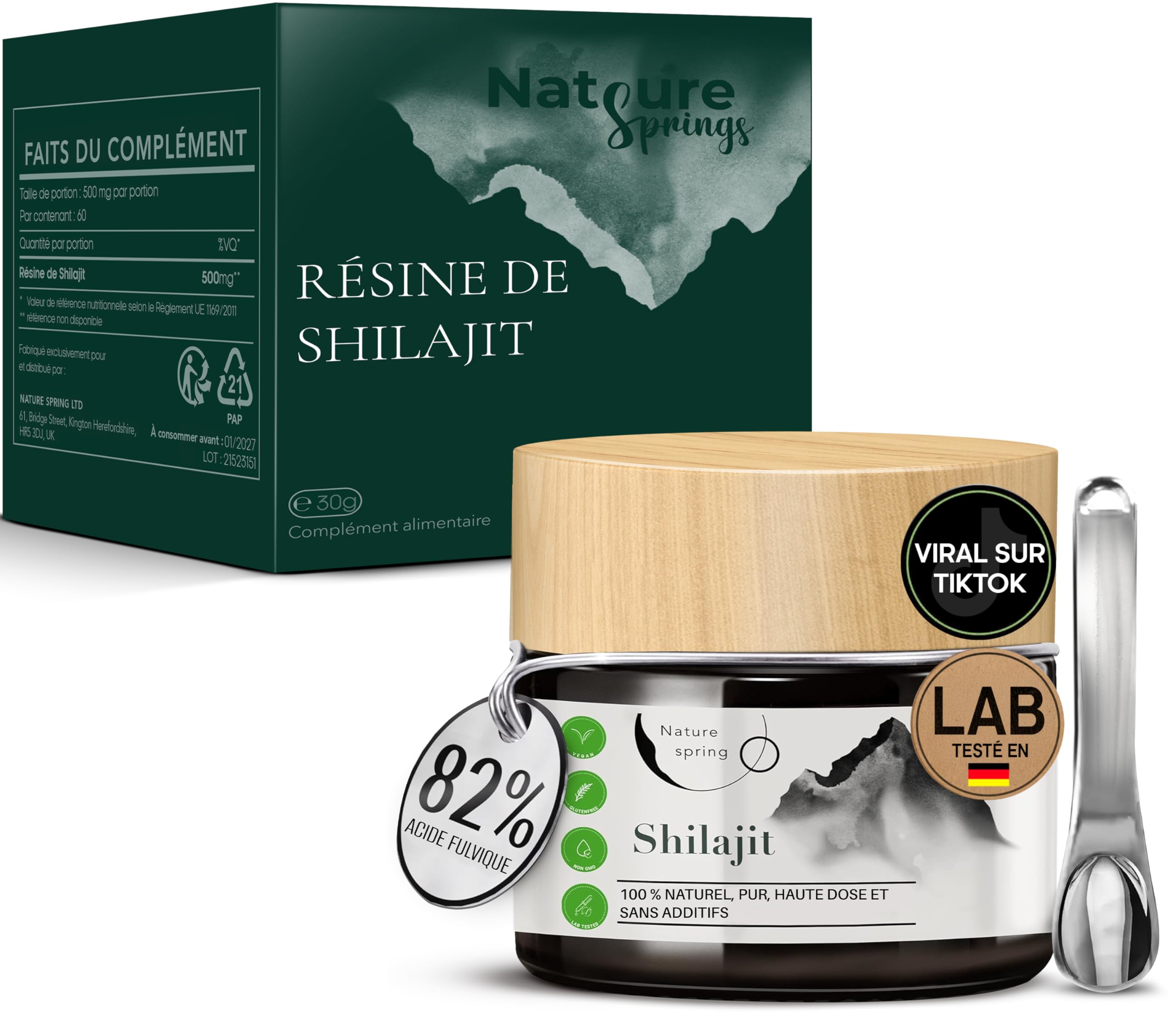 Shilajit Résine en Verre Premium 2 Mois Source Himalayenne Haute Puissance avec Acide Fulvique Acide Humique et Oligo-éléments Nature spring