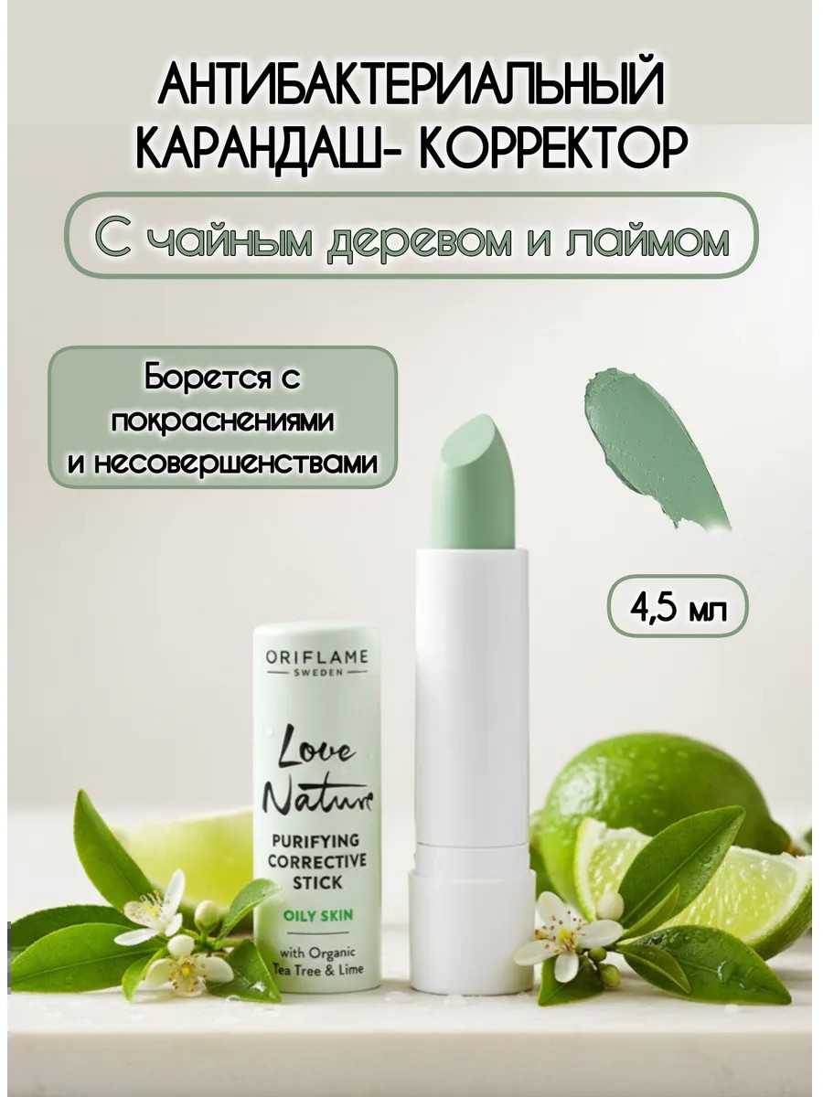 Созданный на основе натурального антибактериального эфирного масла чайного дерева и суперингредиента лайма, карандаш-корректор Love Nature помогает уменьшить видимость несовершенств кожи, даже если ты находишься в дороге. Просто проведи карандашом по поражённому участку и дай компонентам подействовать, чтобы добиться безупречного цвета лица и нейтрализовать покраснение.