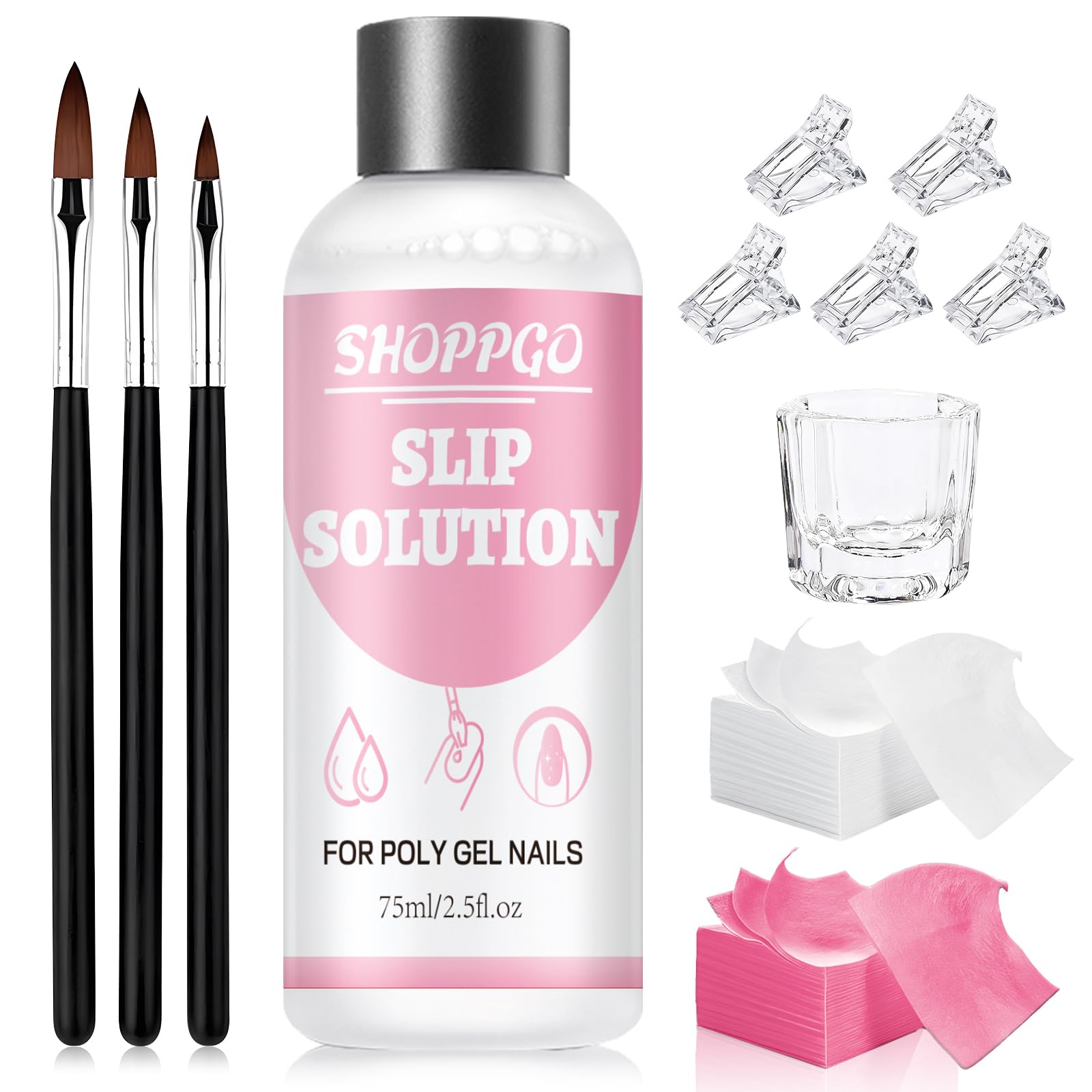 Safe and odorless: Slip solution is made with healthy, high-quality materials. It won't damage the nail surface. For nail art enthusiasts, beginners, or novices, it's an essential accessory for a professional gel nail starter kit. Multiple uses: Slip solution can also be used as a cleaner for nail brushes, nail pens, and nail art brushes. It removes and cleans gel, oil, or powder residue from nail brushes. Effective removal: Pour slip solution into a clear container, soak a clean cotton ball in the solution, and clean the gel nails. Alternatively, apply it with a brush to effectively remove the sticky layer and oil stains from the nail surface. Slip solution works perfectly with all types of nail gel. Thanks to its non-stick formula, it effectively reduces the gel's viscosity, making it easier to apply, spread, and shape. The SHOPPGO Slip Solution Polygel kit includes 75ml of slip solution, 3 nail art brushes in different sizes, 1 crystal glass, 5 nail art clips, and 100 nail cleaning pads. A complete set of accessories to best meet your manicure needs.SHOPPGO Slip Solution Polygel, 75ml Slip Solution, con 3 Brosses, 1 Coupe en Cristal, 100 Feuilles de Nettoyage, 5 Pinces ManucureSûr et sans odeur : la solution slip est fabriquée avec des matériaux sains et de haute qualité. N'endommage pas la surface de l'ongle. Pour les amateurs de nail art, débutants ou néophytes, c'est un accessoire indispensable pour un kit de base professionnel pour ongles en gel. Fonctions multiples : la solution à slip-peut également être utilisée comme nettoyant pour pinceaux à ongles, comme stylos à ongles et pinceaux pour nail art. Enlève et nettoie les résidus de gel, d'huile ou de poudre à ongles des brosses à ongles. Enlèvement efficace : verser une solution de slip dans un récipient en cristal, tremper un coton propre dans le liquide antidérapant et nettoyer les ongles en gel, ou bien l'appliquer avec un pinceau pour enlever efficacement la couche collante et les taches d'huile de la surface de l'ongle. Slip solution fonctionne parfaitement avec tous les types de gel pour ongles. Grâce à sa formule antiadhésive, il réussit à réduire efficacement la viscosité du gel, ce qui le rend plus facile à appliquer, à étendre et à modeler. Le kit SHOPPGO Slip Solution Polygel comprend 75 ml de solution slip, 3 pinceaux pour nail art de différentes tailles, 1 verre en cristal, 5 clips pour nail art et 100 disques de nettoyage des ongles. Accessoires complets pour répondre au mieux à vos besoins de manucure.