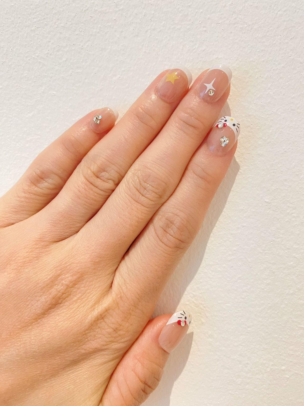 Short Squoval Nude French Hello+ + Kitty Cute Diamond Fake Press On Nail Set