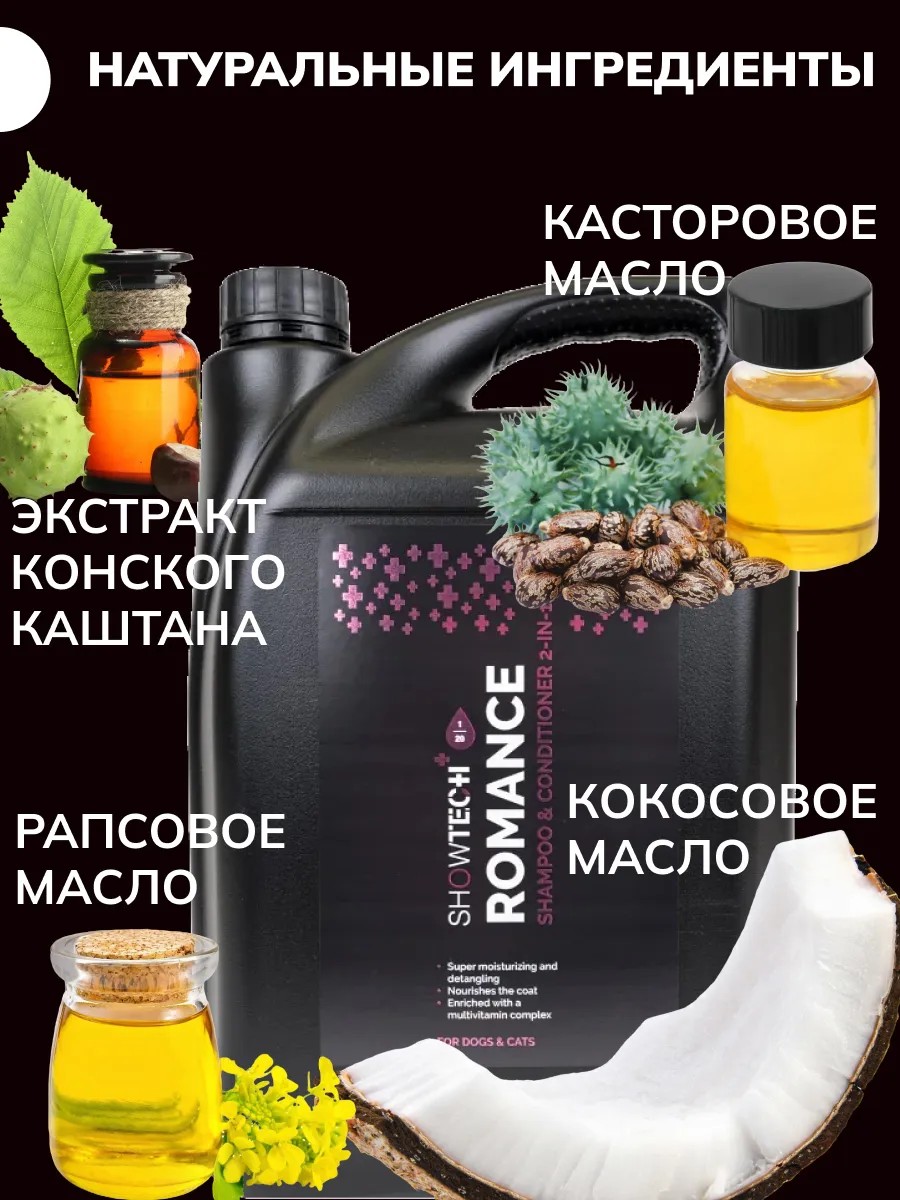 Тщательно разработанная формула содержит экстракты конского каштана и рапсовое, кокосовое и касторовое масла. Эти растительные кондиционеры помогают распутывать узлы и колтуны, облегчая расчесывание шерсти. Восстанавливает сухую и поврежденную шерсть, благодаря чему она снова становится здоровой и не спутывается! Шерсть восстановится, а стрижка ножницами станет намного проще. Благодаря питательным маслам, которые увлажняют шерсть, стимулируется рост шерсти. Кроме того, шампунь Romance обогащен поливитаминным комплексом (витамины A, B, E, F и H), который необходим для здоровья кожи, а также для питания шерсти и стимулирования ее роста.