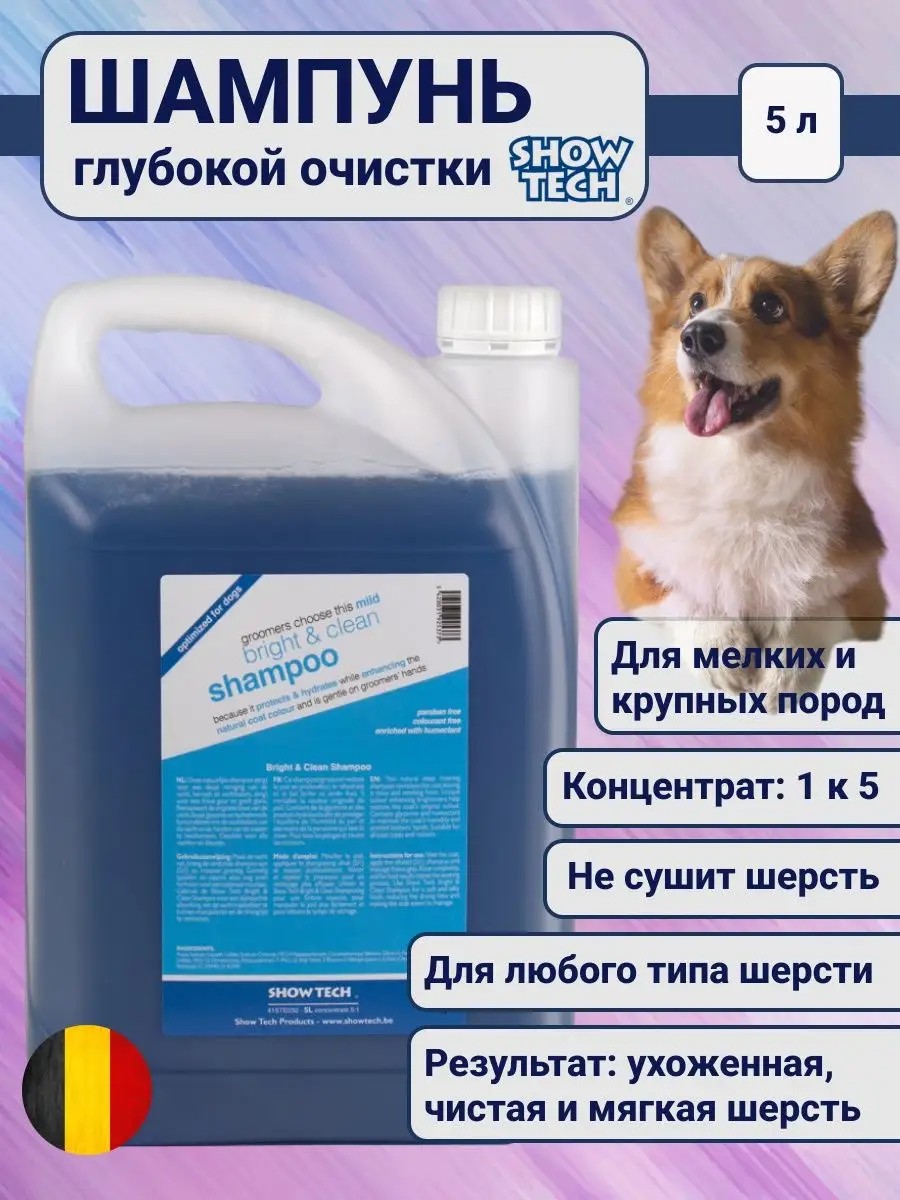 Show Tech 5-liter deep-cleaning shampoo thoroughly cleans heavily soiled fur, restores its original color, and removes unpleasant odor.