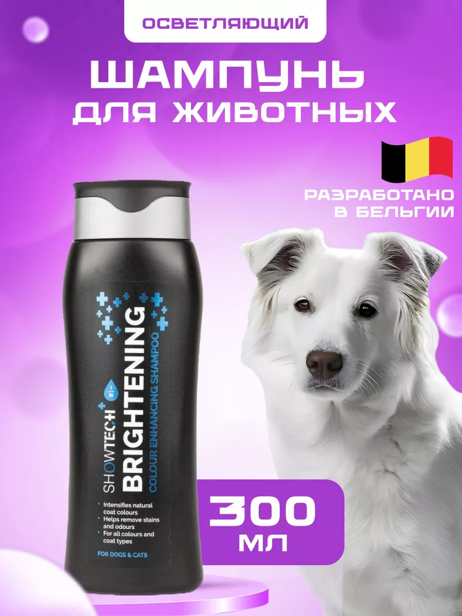 This brightening shampoo for pets is carefully formulated specifically for white dogs and cats. It's ideal for those who want to restore their pet's healthy appearance. This professional hygiene product lathers richly, thoroughly cleans away any dirt and odors, degreases, and moisturizes. Its unique formula eliminates stains and yellowing. Gentle whitening ingredients help restore the original color. Safe and effective for all coat types, it provides comfort for your pet. Can be used regularly.
