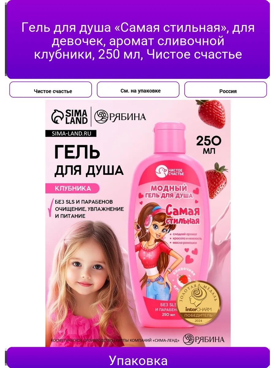| Комплектация | Гель для душа «Самая стильная», для девочек, аромат сливочной клубники, 250 мл, Чистое счастье |
