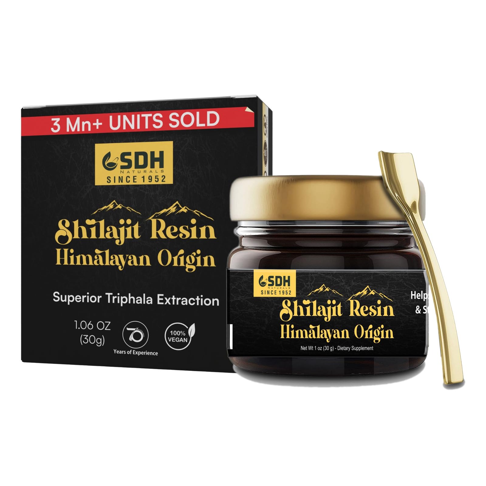 FROM SDH (Since 1952) - TRADITIONAL ROOTS VIA SCIENTIFIC ROUTES - Leading in R D, SDH has produced 400 products blending modern science and Ayurveda. Trusted by 80,000 doctors in India, SDH is poised for global expansion. CLEAN, SAFE SHILAJIT - Manufactured in a GMP-certified facility, our Shilajit non-GMO, gluten soy free — delivering purity, potency, and results you can trust. ZERO SUGAR SUPPLEMENT, MESS FREE AND EASY TO USE – Our Shilajit contains zero sugar, ensuring a clean, guilt-free experience. It comes with a convenient spoon for dosing. Simply take a pea-sized amount, mix with water, milk, or tea, and enjoy!. PURIFIED USING TRIPHALA FOR EXTRA POTENCY AND BENEFITS - Triphala extraction, a premium Ayurvedic extraction method, not only purifies Shilajit but enhances its benefits. Triphala helps in better digestion, and improved absorption. HIMALAYA SHILAJIT, FULLY LOADED WITH MINERALS - Sourced directly from the Himalayas, our Shilajit Resin is loaded with 85 trace minerals and 70 fulvic acid for maximum potency that helps support energy, stamina, immunity, and promote overall well-being .