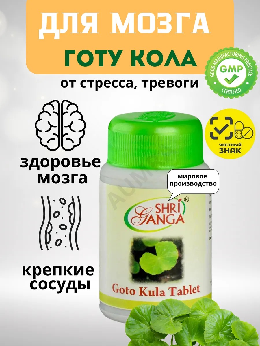 Goto Kula tablets от компании Shri Ganga 100таблеток - является ноотропным препаратом нейропротектором. Улучшает память стимулирует жизнеспособность клеток головного мозга, улучшает нервную и психическую выносливость увеличивает умственные способности уменьшает стресс и беспокойство восстановления функций ЦНС. Является замечательным средством для медитации.