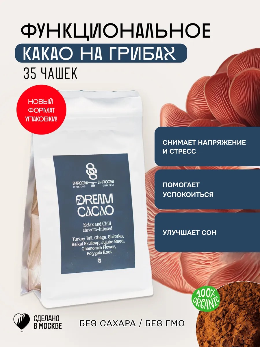 Хотите расслабиться вечером после тяжелого рабочего дня? Натуральное какао на основе грибов от SHROOM SHROOM - это оригинальный напиток, который подарит вам целый комплекс полезных витаминов и микроэлементов, обеспечит хорошее самочувствие и спокойный сон!