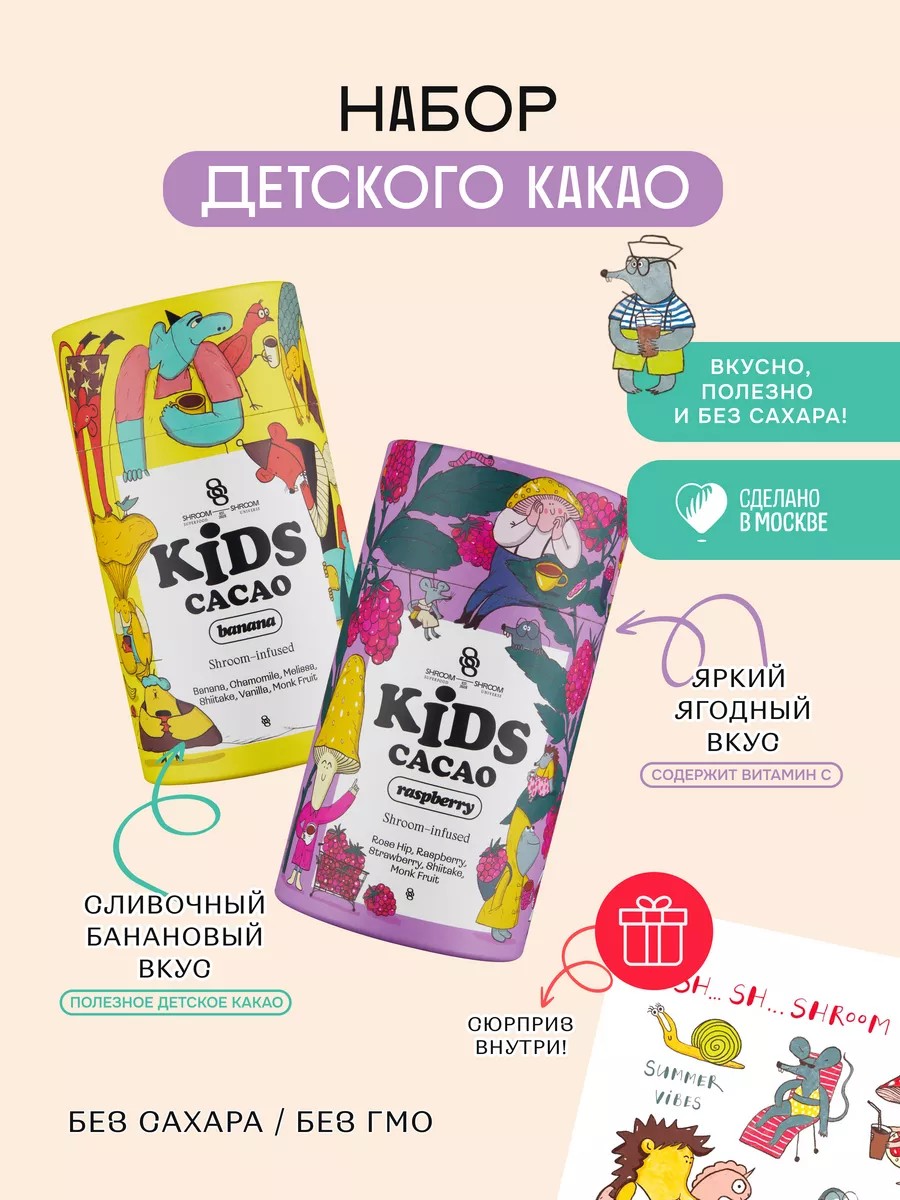 Вы хотите дополнить рацион своего ребенка витаминами и минералами? Подарить ему бодрость, силы, энергию и хорошее настроение на целый день? Набор функционального какао KIDS CACAO с банановым и ягодным вкусом SHROOM SHROOM позволит вашему малышу насладиться питательным и ароматным напитком, который не только поможет ему насытиться, но и обеспечит максимум пользы для здоровья организма!