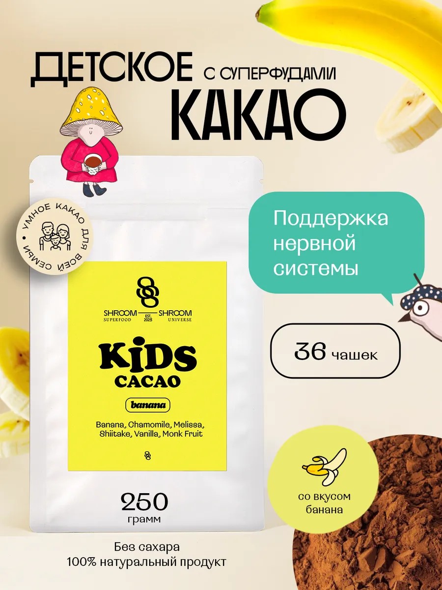 Kids Cacao Banana functional cocoa with banana flavor from SHROOM SHROOM will allow your little one to enjoy a nutritious and aromatic drink that will not only help them feel full but also provide maximum health benefits!