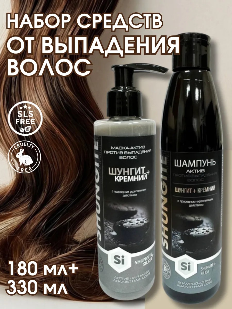 Набор средств против выпадения волос: Шампунь-актив против выпадения волос «Шунгит + Кремний» серии "Shungite", маска-актив против выпадения волос «Шунгит + Кремний».