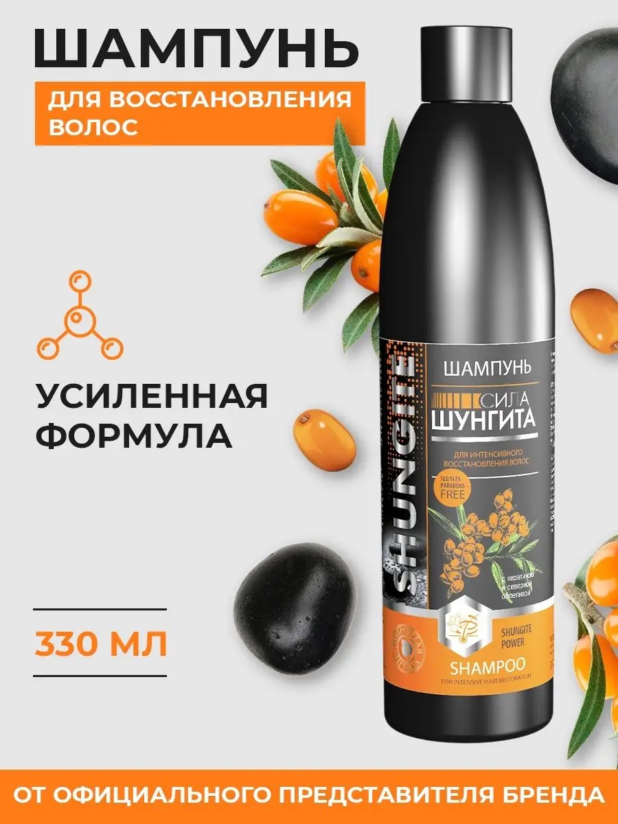 Shungite Shampoo, a deep scalp cleanser and anti-hair loss treatment, effectively protects and cleanses men's and women's hair from environmental aggressors. The enhanced formula of Shungite Shampoo, a natural pharmacy, gently cleanses, nourishes, and restores hair structure. It increases elasticity and protects against breakage, adds volume at the roots, and is designed to restore and nourish. Highly active natural Karelian shungite saturates the hair and scalp with essential microelements, strengthens the roots, and provides an antioxidant effect. Keratin strengthens and recreates the protective keratin layer of the hair, giving it strength and a silky effect. Northern sea buckthorn, rich in natural fatty acids, nourishes hair, adding shine and softness, restoring dry and weakened ends, activating hair follicles, and accelerating hair growth. Burdock extract, as one of the ingredients, has a strengthening, cleansing, and restorative effect. Not used to neutralize yellowness. It works as a sulfate-free shampoo. This treatment is recommended for oily, color-treated, curly, dry, and damaged hair. Results are achieved in 3-4 uses. Contains no silicones or parabens. High quality guaranteed. Volume: 330 ml. For daily use. Natural cosmetics Black Shungite – an organic formula for beautiful hair and skin. We also recommend purchasing the moisturizing shower gel and hair conditioner from the Shungite series.
