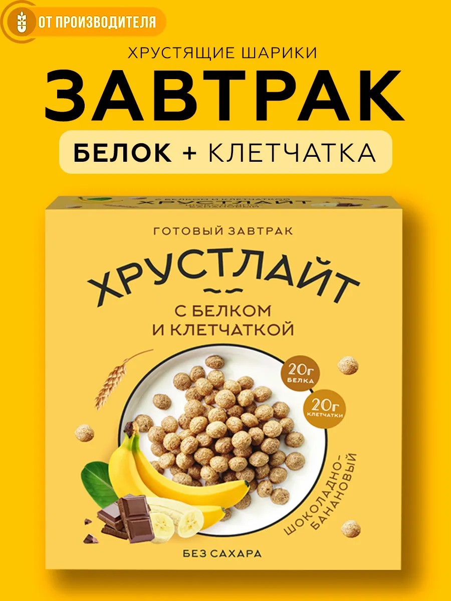 Start your day with crunchy joy and health with Khrustlite breakfast cereal from Siberian Fiber! These delicious chocolate-banana balls are a great choice for those who value healthy eating and don't want to sacrifice taste. Khrustlite isn't just a healthy breakfast; it's a boost of energy for the whole day! Its high protein content (20 g per 100 g) will help you stay full longer, and its natural, sugar-free formula makes it ideal for those watching their health, including diabetics. These crispy balls with the rich chocolate and banana flavor will appeal to both adults and children, and the convenient packaging makes Khrustlite easy to take to work, school, or on the go. Treat yourself to healthy sweets and savor every crunchy bite!