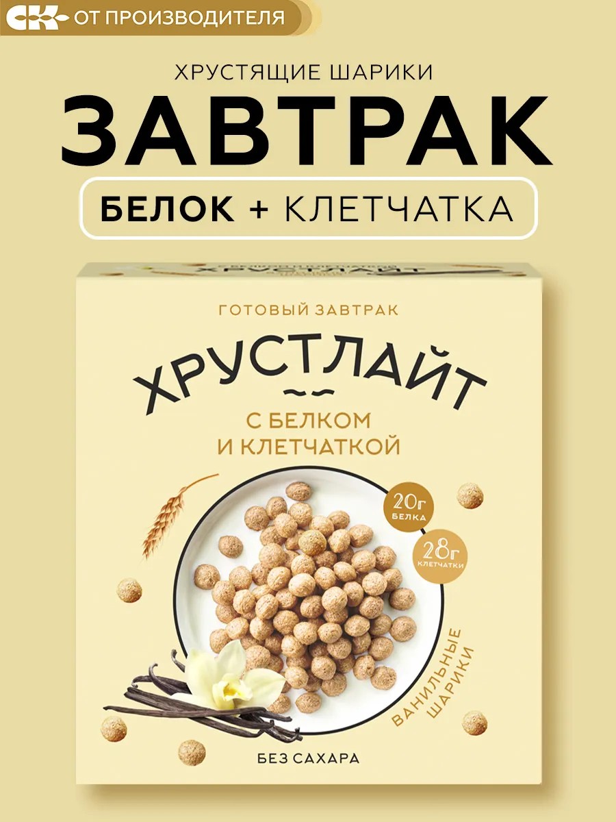 Начните свой день с хрустящей радости и пользы вместе с готовым завтраком Хрустлайт с ванилью от Сибирской клетчатки! Эти вкусные шарики с добавлением белка станут отличным выбором для тех, кто ценит здоровое питание и заботится о своем здоровье. Хрустлайт - это не просто вкусный завтрак, это заряд бодрости и энергии на весь день! Благодаря натуральному составу без сахара, он подходит для детей и людей, следящих за своим весом, а также для диабетиков. Вкусный ванильный аромат и хрустящая текстура сделают ваше утро приятным и сытным. Побалуйте себя и своих близких полезными сладостями, которые подарят заряд энергии и отличное настроение!