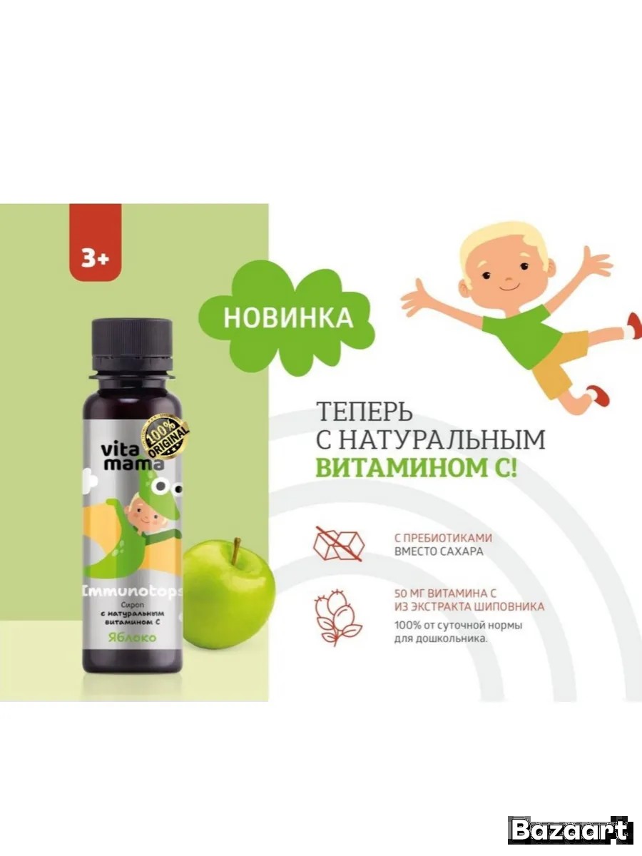 Сироп с пребиотиками вместо сахара и яблочным низкоаллергенным соком. Самое ценное в нем – это натуральный топовый источник витамина С из экстракта шиповника. Всего в 1 чайной ложке – полноценная детская дозировка. И вирусы больше не страшны!