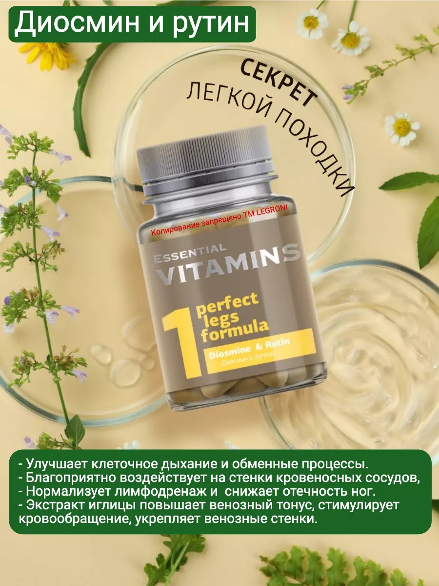 Натуральный венотоник на основе диосмина и рутина для предотвращения нарушений лимфотока и кровообращения в ногах. Благодаря оптимальным дозировкам комплекс эффективно воздействует на стенки сосудов, укрепляет их, улучшает лимфоток и микроциркуляцию крови. Благодаря оптимальным дозировкам комплекс эффективно воздействует на стенки сосудов, укрепляет их, улучшает лимфоток и микроциркуляцию крови. Улучшают клеточное дыхание и обменные процессы. Благоприятно воздействуют на капилляры и стенки кровеносных сосудов, уменьшая их проницаемость и делая менее хрупкими. Нормализуют лимфодренаж и уменьшают застойные явления, снижая отечность ног. Экстракт иглицы повышает венозный тонус, стимулирует кровообращение, укрепляет венозные стенки, а также улучшает метаболизм клеток и укрепляет капилляры. (сибирское здоровье)