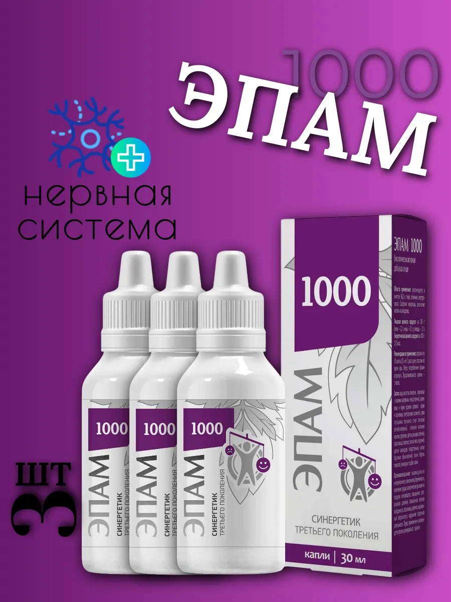 Поддержка нервной системы. ЭПАМ 1000 − источник активных веществ, которые способствуют поддержке нервной системы и оказывают общеукрепляющее действие на организм. Ежедневные стрессы и умственные нагрузки, а также психоэмоциональное напряжение в осложнившейся эпидемиологической ситуации негативно сказываются на самочувствии и ослабляют иммунитет. В состав ЭПАМ 1000 вошли натуральные компоненты, которые традиционно используют для поддержания работы нервной системы и защитных сил организма.1. Базовый комплекс. Переживания, стрессы, бессонница истощают организм и приводят к дефициту сил. Маточное молочко и прополис – это мощными адаптогены, которые повышают сопротивляемость к психоэмоциональным и физическим нагрузкам. Они укрепляют иммунную систему безопасным и естественным способом, не изнуряя ее, а приводя в тонус и режим боеготовности.2. Направленный комплекс. Активные вещества растений нормализуют работу центральной нервной системы. Экстракты родиолы розовой, элеутерококка и валерианы традиционно применяют при стрессах, неврозах, неврастении и нервных переутомлениях. Содержащиеся в них вещества помогают организму выработать устойчивость к стрессам, уменьшают беспокойство и дают ощущение жизненных сил.3. Фоновый комплекс. Экстракты растений фонового комплекса поддерживают здоровье сердечно-сосудистой системы, улучшают обмен веществ и положительно действуют на органы пищеварения.4. Применение Взрослым по 10 капель (0,5 мл) 2 раза в день под язык во время еды. Перед употреблением флакон встряхнуть. Продолжительность приема ‑ 1 месяц. При необходимости прием повторить. Рекомендуется в качестве биологически активной добавки к пище, источника элеутерозидов, содержащей иридоиды, деценовые кислоты и салидрозид. Противопоказания: индивидуальная непереносимость компонентов, беременность, кормление грудью, аллергические реакции на продукты пчеловодства, повышенное артериальное давление, повышенная нервная возбудимость, бессонница, аритмия, выраженный атеросклероз, нарушение сердечной деятельности.