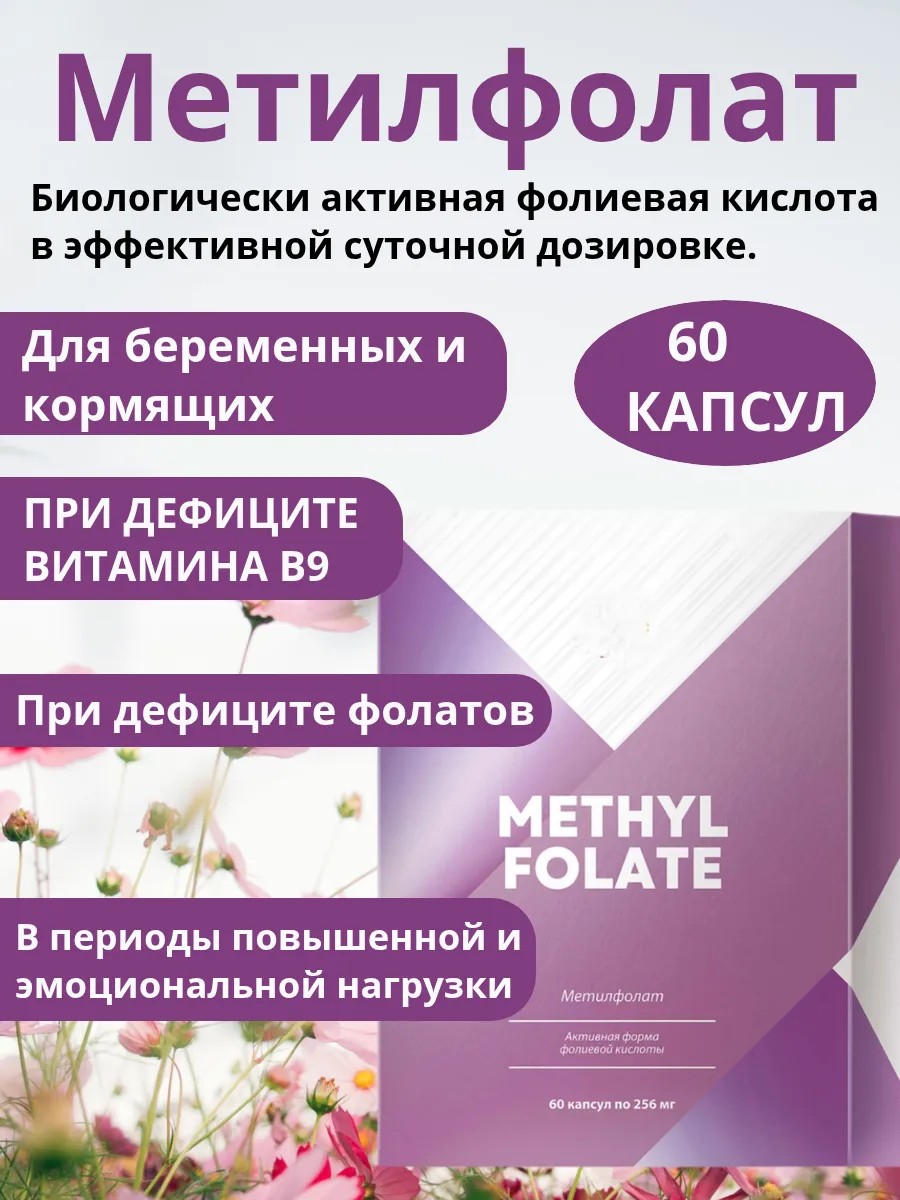Высокая биодоступность Биологически активная фолиевая кислота в эффективной суточной дозировке. Разрешено беременным и кормящим Фолиевая кислота особенно важна в период беременности и кормления грудью. Швейцарское качество Metafolin от DSM Nutritional Products Europe ltd. Биологически активная форма Восполняет дефицит витамина В9 даже при полиморфизме генов фолатного цикла. Закройте дефицит фолиевой кислоты! Современное решение – быстрый результат Фолиевая кислота (витамин В9) играет важнейшую роль во многих процессах: от создания кровяных клеток, которые переносят кислород к тканям, до предотвращения врожденных аномалий. Дефицит фолатов может привести: – к увеличению риска развития сердечно-сосудистых заболеваний, болезни Альцгеймера и остеопороза; – появлению аномально больших эритроцитов, что провоцирует развитие анемии; – порокам развития плода (дефекту нервной трубки); – нарушению регенерации кожи и слизистых; – предраковым состояниям. Изменения в ассортименте продуктов питания за последние десятилетия (сокращение потребления фруктов и овощей) привело к массовому гиповитаминозу витамина В9 у большинства населения Земли. Другой причиной дефицита фолиевой кислоты являются генетические мутации, вследствие которых витамин В9 некорректно усваивается. Современное решение проблемы дефицита фолатов – «Метилфолат» серии Women’s Health! Фолиевая кислота – элемент здоровья Защита сердца Содействует разрушению гомоцистеина, высокий уровень которого может способствовать развитию сердечно-сосудистых заболеваний, инсульта и образованию тромбов. Незаменима для женщин Предотвращает снижение уровня фолатов, приводящее к развитию анемии из-за нарушения нормального деления эритроцитов. Необходима подросткам и беременным Обеспечивает деление и восстановление клеток во время периодов быстрого роста (подростки и маленькие дети). Anti-age защита Поддерживает синтез ДНК и предотвращает ее повреждение. Иммунная поддержка Способствует быстрому делению иммунных клеток и детоксикации за счет участия в метилировании. Активизация умственной энергии Метилфолат усиливает синтез ацетилхолина в головном мозге – нейромедиатора, связанного с функцией памяти. Фолат L-MTHF Metafolin от DSM Nutritional Products Europe ltd имеет высокую биодоступность, то есть легко усваивается организмом человека. Он не подвержен влиянию генетических вариаций, которые у определенного процента населения препятствуют эффективному преобразованию традиционных фолиевых кислот в форму, необходимую для поддержания здоровья. Железо и фолаты: беременным и всем женщинам Комбинировать препараты железа и фолатов традиционно рекомендовано при беременности. Исследования показывают, что применение этих компонентов повышает эффективность лечения и профилактики железодефицитной анемии (ЖДА) у беременных, а между тем анемия встречается более чем у 40% женщин Комбинированные добавки желательно принимать всем женщинам репродуктивного возраста, поскольку они находятся в группе риска из-за регулярных менструальных кровопотерь. Показанием к приему железа и фолатов также служит ухудшение самочувствия, слабость, бледность кожи, ломкость волос и ногтей. В каждой упаковке: • 400 мкг фолиевой кислоты в 1 капсуле Высокоусвояемая форма, разрешенная беременным и кормящим. • 100% от АУП* в 1 капсуле Дозировка, п