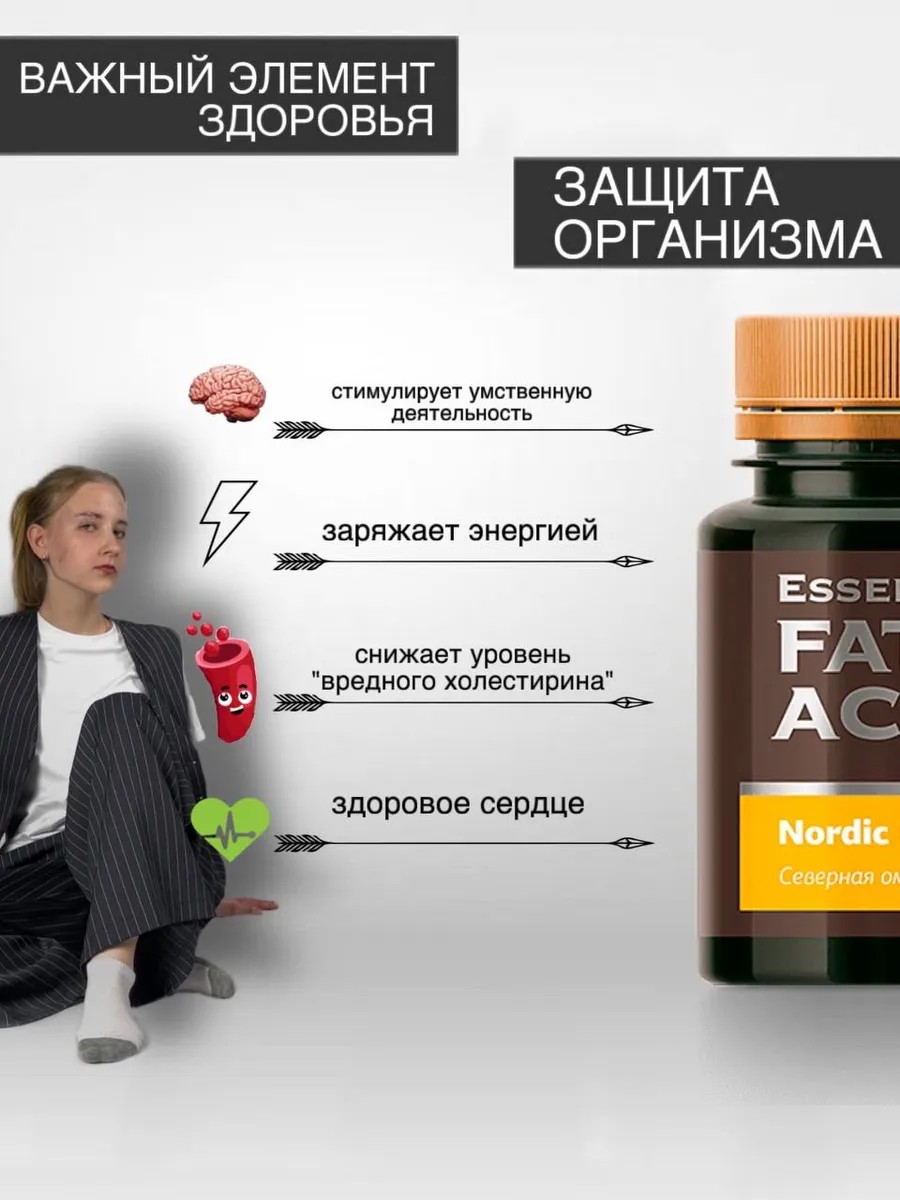 Сверхчистый комплекс омега-3 MEG-3 ( Швейцария) из жира глубоководных морских рыб. Благодаря оптимальному соотношению эйкозапентаеновой и докозагексаеновой кислот Nordic Omega нормализует состояние сосудов, улучшая кровоснабжение и работу внутренних органов. Особенно важно это для здоровье сердца и мозга. Кроме того, омега-3 снижает оксидативный стресс в органах зрения, поддерживает нормальную работу суставов, снижает уровень «вредного» холестерина, ускоряет метаболизм и способствует снижению массы тела. Сибирское Северная омега-3 серии Essential Fatty Acids стандартизирована по содержанию полезных веществ и полностью очищена от посторонних вредных примесей.Полиненасыщенные жирные кислоты чрезвычайно важны для правильной выработки гормонов, развития и функционирования репродуктивной системы, что делает их важнейшей составляющей рациона детей и подростков. Применение: Взрослым принимать по 3 капсулы в день во время еды.