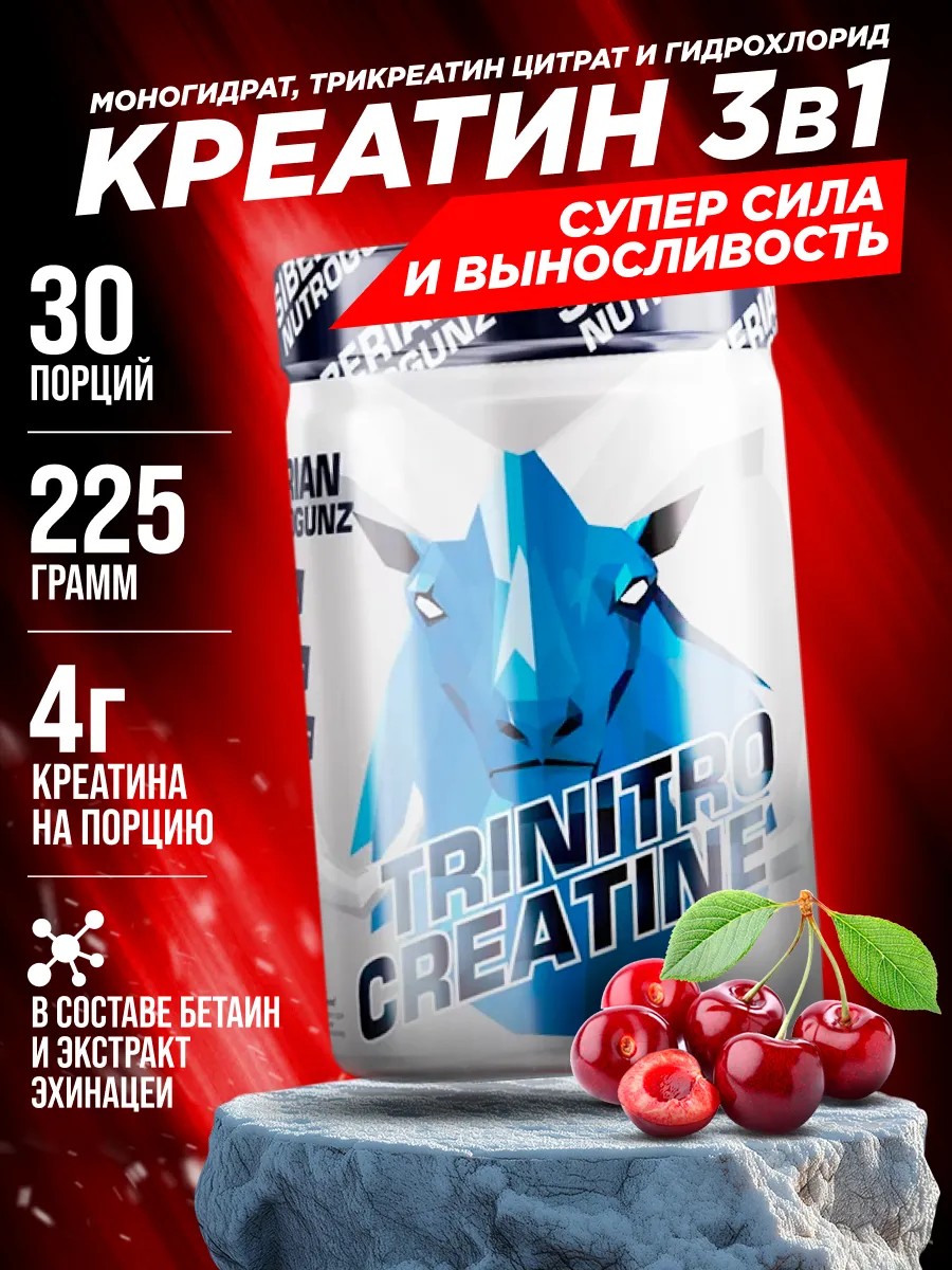 ## SIBERIAN NUTROGUNZ TRINITRO CREATINE 2.0 225g. The TriNitroCreatine formula combines two of the most proven forms of creatine (monohydrate and hydrochloride). Working synergistically with betaine, it is easily absorbed and reaches the muscles. Echinacea extract is renowned for its ability to support immunity and increase appetite. TriNitroCreatin is most effective when taken daily for a month, with any meal.