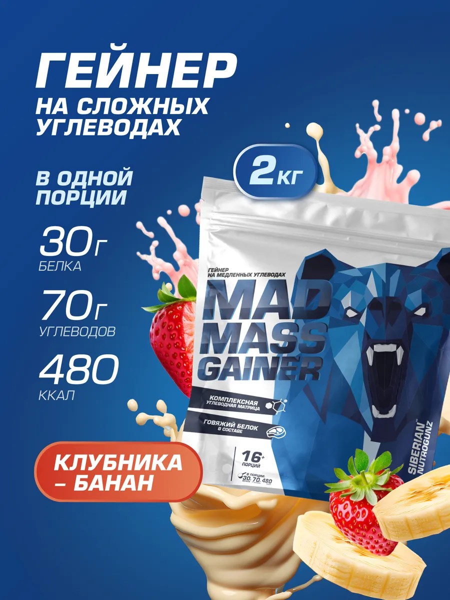MAD MASS GAINER от Siberian Nutrogunz — первый в РФ гейнер с комплексной углеводной матрицей, состоящей из медленных, или как их еще называют, сложных и быстрых углеводов. Основа — цельнозерновая рожь (38%), дополненная говяжьим белком (25%), что обеспечивает полноценное питание организма. Входящая клетчатка помогает в работе пищеварительной системе. Благодаря такому составу, имеет легкое усвоение и длительное насыщение. Продуктом идеально дополнять свой дневной рацион в любое время, как отдельный прием пищи. Данный легкоусваиваемый белково-углеводный напиток поможет набрать мышечную массу и сохранит комфортное пищеварение. Осторожно, возможен медвежий рост мышц*.