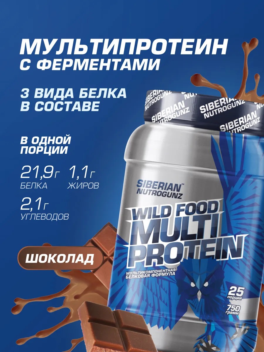 WILDFOOD MULTIPROTEIN — премиальный мультикомпонентный белковый коктейль. Молочная сыворотка, казеин и яичный белок обеспечивают богатый аминокислотный профиль и постепенное высвобождение аминокислот. Дополнительная смесь LIGHT DIGEST включает пребиотические пищевые волокна (полидекстроза) и протеолитический фермент (бромелайн), что помогает в более легком усвоении продукта.