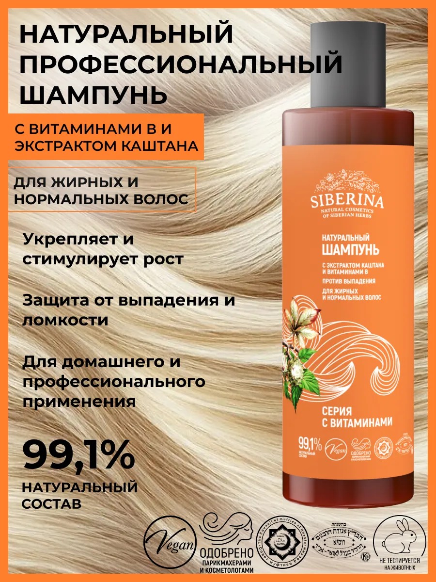 Натуральный шампунь с экстрактом каштана и витаминами В «Против выпадения» — это идеальное решение для ухода за нормальными и жирными волосами. Этот лечебный шампунь подходит для чувствительной кожи головы, обеспечивая мягкий уход без раздражений. Состав продукта включает укрепляющий комплекс витаминов: В6 способствует восстановлению поврежденных прядей, делая их сильными от корней до кончиков, а В3 успокаивает кожу головы. Аллантоин вместе с витамином В7 регулируют работу сальных желез, что помогает дольше сохранять волосы чистыми и свежими. Эфирное масло иланг-иланг восстанавливает структуру изнутри, защищает от ломкости и придает сияние даже самым сухим волосам. Экстракты каштана и крапивы способствуют уплотнению структуры волоса, увеличивая объем и густоту. Пшеничный протеин увлажняет волосы, предотвращая обезвоживание и придавая гладкость. Этот эко продукт идеально подходит как средство против выпадения волос благодаря своей натуральности. Шампунь можно использовать ежедневно или в качестве профилактики — он способствует росту здоровых локонов. Хранить при температуре от +5 до + 25 гр. Способ применения: массирующими движениями нанесите средство на влажные волосы, вспеньте и через 2-4 минуты смойте. В случае попадания в глаза промойте проточной водой. Полный состав продукта смотрите на фото (листайте галерею в карточке товара). Обратите внимание: в поле «Состав» порядок компонентов может отображаться в случайном порядке.