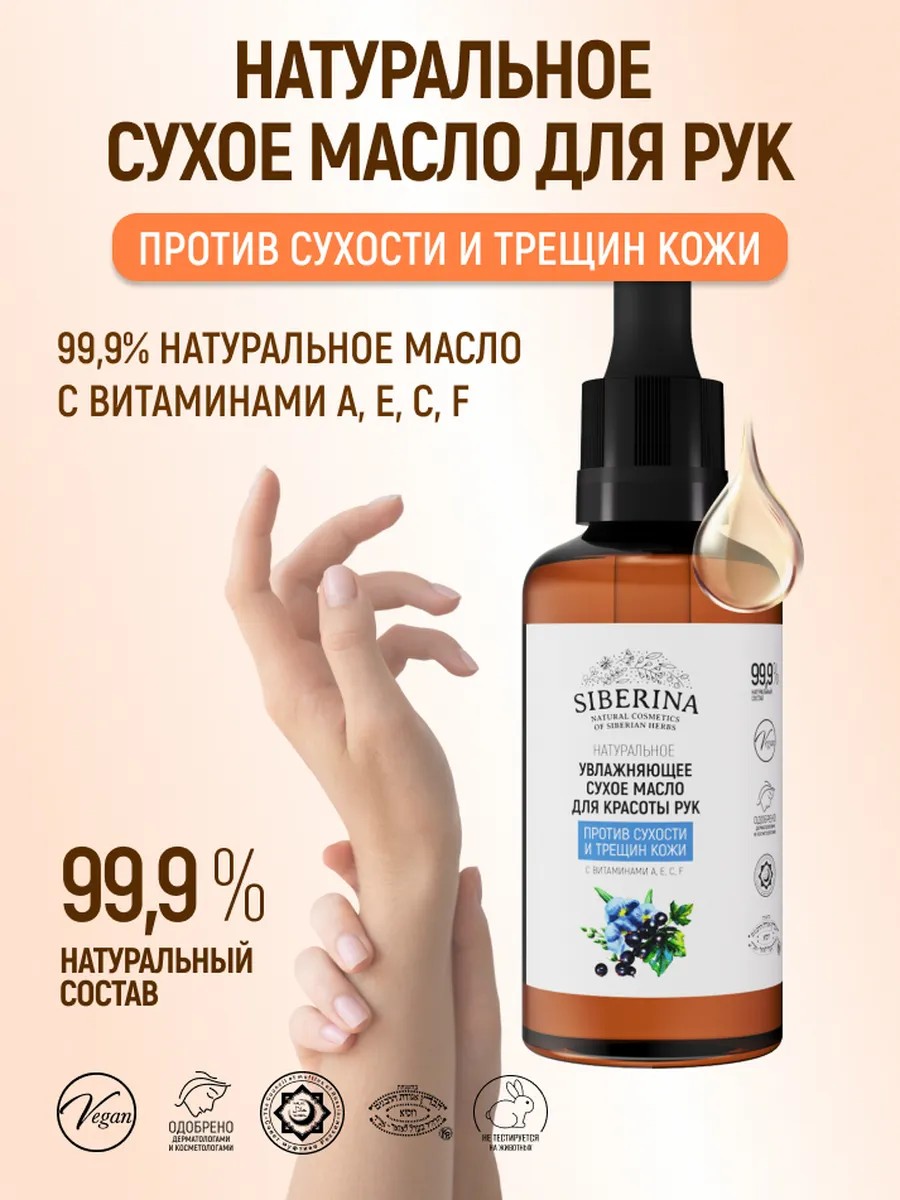 Натуральное увлажняющее сухое масло для рук — это идеальное средство для ухода за кожей, которое помогает справиться с проблемами сухости и трещин. Это масло содержит витамины А, Е, С и F, которые обеспечивают полноценное питание и восстановление кожи. Масло шиповника в составе является природным источником витамина С, который защищает кожу от УФ-излучения и стимулирует синтез коллагена. Оно также предупреждает истончение ногтей и способствует их укреплению. Льняное масло богато витамином F, который смягчает и питает сухую кожу рук. Оно восстанавливает её структуру и ускоряет заживление трещин. Экстракт моркови с бета-каротином (провитамин А) придаёт коже гладкость, избавляет от пигментных пятен и делает её более молодой на вид. Витамин Е — важный микроэлемент для красоты кожи рук: он защищает от старения, способствует синтезу эластина и коллагена, повышая увлажнённость кожи. Натуральные растительные компоненты масла обеспечивают деликатный уход за кутикулой. Способ применения: нанесите масло на сухую, чистую кожу рук легкими массажными движениями. Полный состав продукта смотрите на фото (листайте галерею в карточке товара). Обратите внимание: в поле «Состав» порядок компонентов может отображаться в случайном порядке.