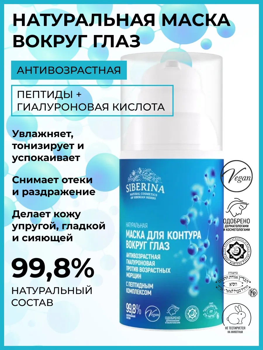 Натуральная антивозрастная маска вокруг глаз с гиалуроновой кислотой и пептидами создана для ухода за нежной кожей вокруг глаз. Она обладает выраженным лифтинг-эффектом и эффективно борется с морщинами, гусиными лапками и отечностью. Эта косметика рекомендуется для зрелой, тусклой, сухой и чувствительной кожи лица. Маска придает сияние коже лица, устраняет следы стресса и отеков благодаря осветляющим свойствам. Она также помогает в борьбе с темными кругами под глазами. Кремовая текстура средства обеспечивает легкое впитывание и дарит увлажнение коже вокруг глаз. Используйте маску 1-2 раза в неделю на область век для достижения максимального эффекта увлажнения. Женская маска является экологичной альтернативой патчам благодаря вакуумному дозатору. Формула содержит натуральные активные компоненты. Пептидный комплекс восстанавливает тонус кожи и стимулирует синтез коллагеновых волокон. Гиалуроновая кислота замедляет старение. Экстракт василька снимает раздражение. Экстракт каштана действует как антиоксидант против отеков. Результат использования омолаживающего и восстанавливающего средства – свежий, открытый взгляд, гладкая кожа и отсутствие мешков! Уходовая косметика для женщин – беспроигрышный подарок на любой праздник: Новый год, 8 марта, 14 февраля или день рождения. Сделайте приятный сюрприз сестре или подруге, маме, любимой девушке или жене. Условия хранения: хранить при температуре от +5 до + 25 гр.