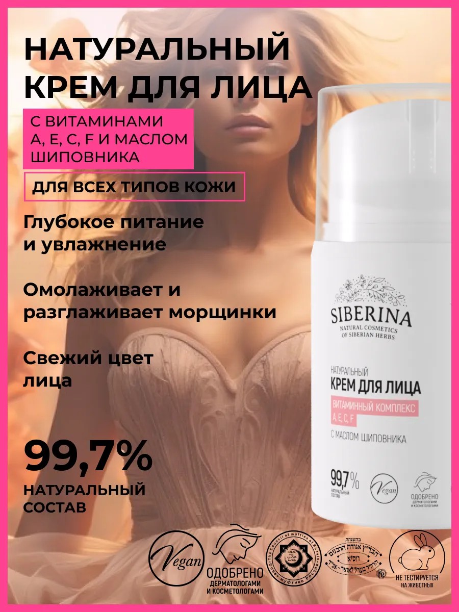 Крем для лица «Витаминный комплекс А, Е, С, F» с маслом шиповника — это натуральный продукт, который обеспечивает комплексный и интенсивный уход за кожей. Содержит витаминный комплекс А, Е, С и F с маслом шиповника, что способствует глубокому увлажнению и сужению пор. Этот крем эффективен в борьбе с морщинами и пигментными пятнами, устраняет дефицит витаминов и восстанавливает защитные функции кожи. Увлажняющий антивозрастной крем подходит для всех типов кожи: сухой, проблемной или чувствительной. Он станет отличным выбором как для возрастной кожи, так и для молодой — начиная с подросткового возраста от 14 лет. Легкая текстура не оставляет жирной пленки на лице. Этот эко-продукт универсален: его можно использовать как дневной крем под макияж или ночное средство перед сном даже в холодное время года — зимой или осенью. Подходит также для зоны шеи и области декольте. Основу составляют вода и природные компоненты: витамин А выравнивает тон лица, масло рисовых отрубей повышает тонус, ламинария регенерирует кожу, масло шиповника разглаживает морщины, экстракт пивных дрожжей стимулирует иммунитет. Органическая уходовая косметика для женщин – хороший подарок на праздник маме, жене, девушке и дочери подростку. Наши витаминные продукты оценит подружка! Условия хранения: хранить при температуре от +5 до + 25 гр. Способ применения: перед первым использованием встряхнуть флакон и медленно нажать на дозатор 15-20 раз. Легкими массажными движениями нанесите на лицо, излишки убрать салфеткой.