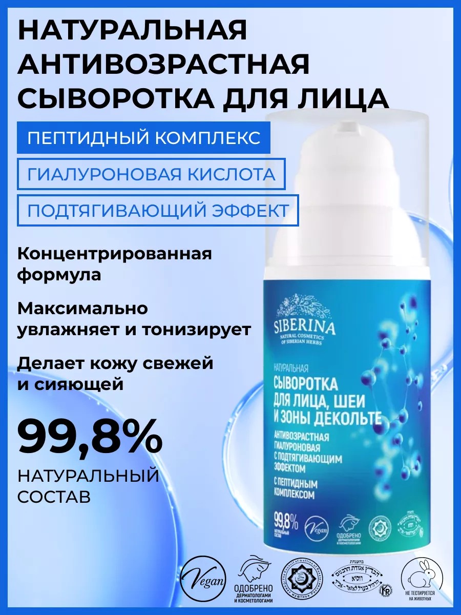 Натуральная антивозрастная сыворотка для лица, шеи и декольте — это идеальное средство для ежедневного ухода за кожей. Сыворотка содержит гиалуроновую кислоту и пептиды, которые обеспечивают интенсивное увлажнение и помогают бороться с признаками старения, такими как морщины и потеря упругости. Легкая текстура средства быстро впитывается, оставляя кожу мягкой и эластичной. Высоко- и низкомолекулярная гиалуроновая кислота в составе сыворотки глубоко увлажняет все слои эпидермиса. Она стимулирует работу фибробластов — клеток, ответственных за молодость кожи, замедляя процессы старения. Пептидный комплекс syn-hycan способствует выработке собственной гиалуроновой кислоты кожи, а также коллагеновых волокон, что помогает восстановить тонус кожи. Экстракт коры березы снимает раздражение и тонизирует кожу лица. Экстракт ламинарии насыщает клетки кислородом и активизирует внутриклеточные процессы. Для достижения максимального эффекта рекомендуется использовать крем после нанесения сыворотки. Сыворотка подходит для дневного и ночного применения на сухой коже с признаками старения: морщинами, складками или тусклым цветом лица. Уходовая косметика с пептидами может быть дополнена этой сывороткой для усиленного эффекта омоложения.