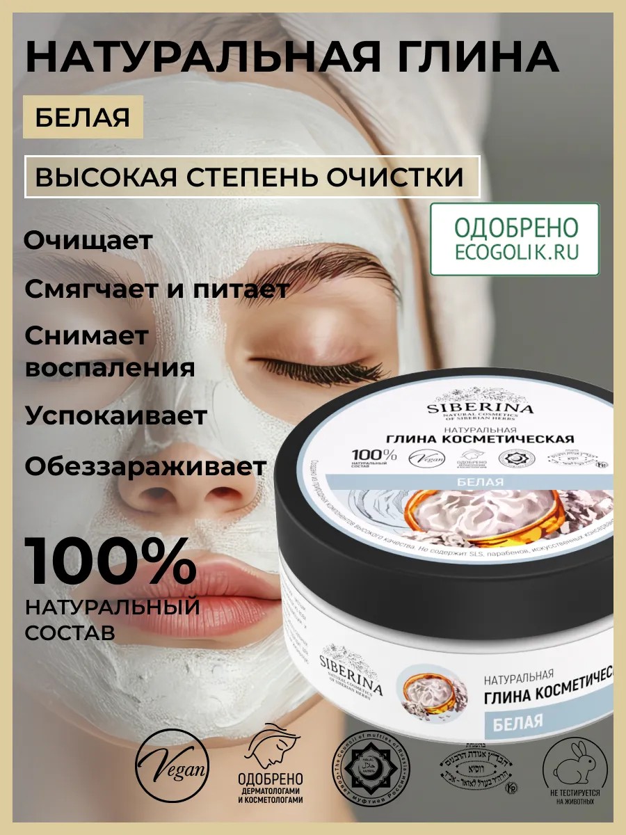 Натуральная белая глина – это универсальное средство для ухода за кожей лица и тела, а также волосами. Она обладает очищающими свойствами, благодаря чему эффективно удаляет загрязнения и излишки кожного жира. Глина содержит минеральные соли и микроэлементы, которые способствуют улучшению состояния кожи, устраняя раздражения и шелушение. Белый цвет глины обусловлен высоким содержанием кремнезема и алюминия, что делает её идеальной для антивозрастного ухода. Эта косметическая маска подходит для всех типов кожи лица. Она успокаивает воспаления, питает кожу полезными веществами и придаёт ей бархатистость. Натуральный состав обеспечивает безопасное использование даже на чувствительной коже. Белая глина также используется в уходе за волосами: она помогает избавиться от излишней сальности жирных волос, возвращает блеск ломким локонам и устраняет неприятные запахи. Применение в виде обертывания способствует улучшению структуры волос. Для тела белая глина применяется как обертывание или пилинг: она выводит токсины из организма через кожу, делая её более упругой и гладкой. Минеральный состав способствует глубокому очищению пор. Условия хранения: хранить при температуре от +5 до +25 гр., избегать попадания солнечных лучей. Упаковка: 150 г. Срок годности: 5 лет. Способ применения: используется, как маска для лица, тела и волос. Добавляется в ванну. Применяется в виде компрессов, примочек, обертывания, пилинга.