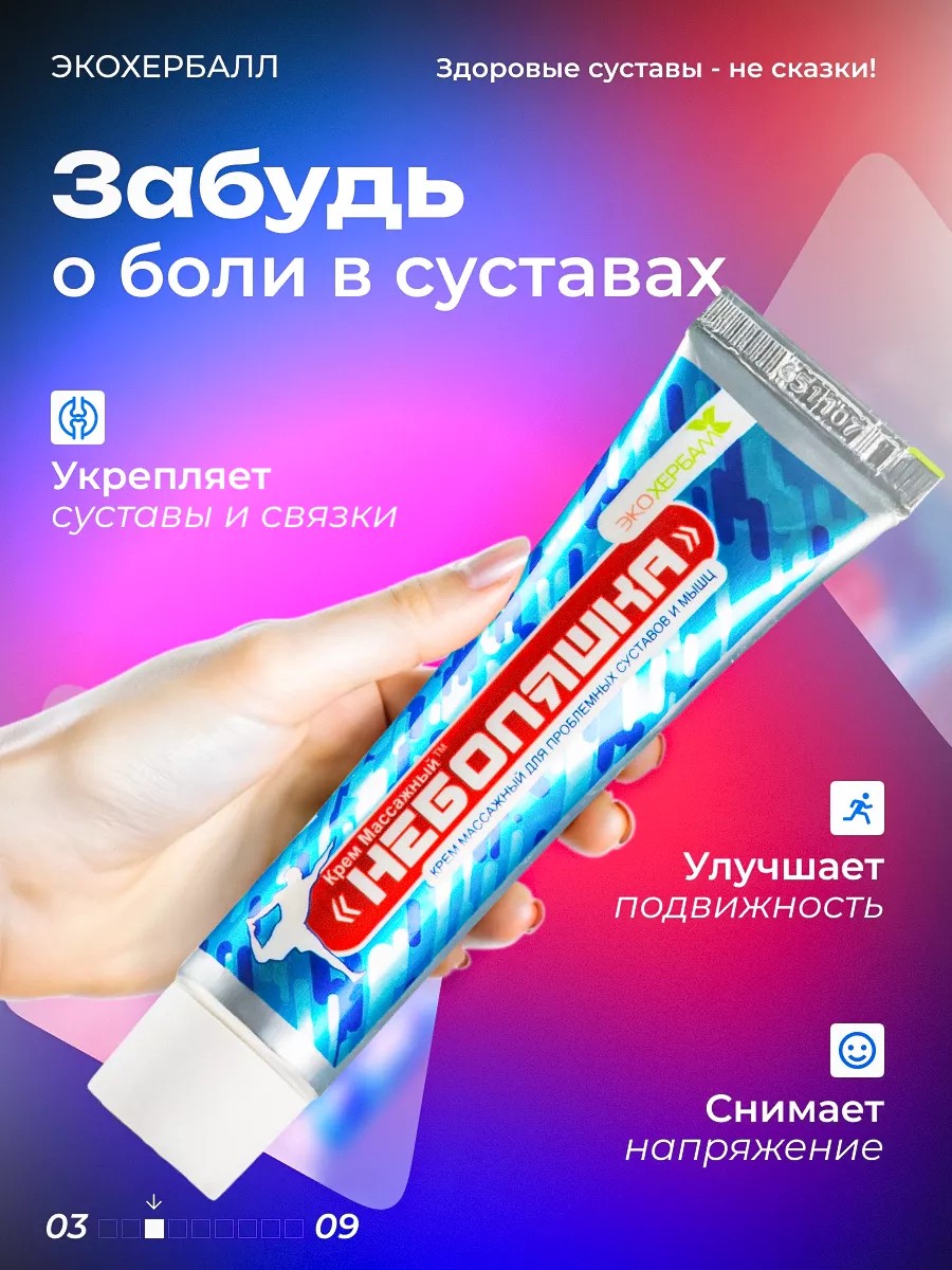 NEBOLYASHKA Joint Pain Ointment is an effective remedy designed to relieve joint and muscle pain. This versatile product can be used both day and night, thanks to its ability to warm the muscles and relieve discomfort.