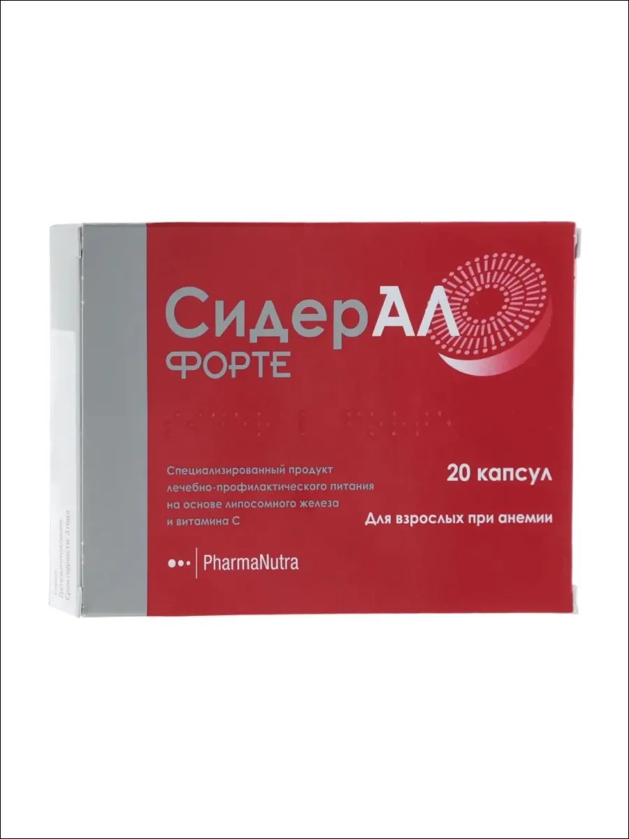 СидерАЛ Форте является специализированным продуктом лечебно-профилактического питания на основе комбинации Сукросомального Железа и Витамина С. Сукросомальное Железо способно практически полностью всасываться и компенсировать дефицит этого элемента в организме. Витамин С улучшает усвоение железа, играет важную роль в синтезе коллагена и в укреплении иммунитета, защищает клетки и ткани от свободных радикалов. Сочетание Сукросомального Железа с Витамином С не только препятствует развитию анемии, но и обеспечивает лечебный эффект при различных железодефицитных состояниях.СидерАЛ Форте могут принимать лица, страдающие непереносимостью глютена. Не является единственным компонентом рациона питания.