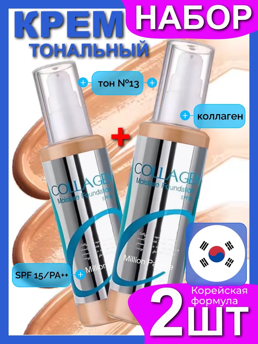 Набор - 2 шт. Классический тональный крем Collagen moisture foundation в тоне № 13 – бежевый лайт оттенок с холодным подтоном и бархатистым финишем. Подходит для светлой и чуть загорелой кожи. Оригинальный тональник с гиалуроновой кислотой придает лицу ухоженный здоровый вид, создает идеальное ровное покрытие и маскирует несовершенства, подстраивается под тон вашего лица, защищает нежную кожу от вредного воздействия солнечных УФ лучей (SPF 15). Этот солнцезащитный тональный крем не окисляется на воздухе, потому не будет "желтить" к вечеру и не потечет, а сохранит мейк красивым надолго. На лице тональник выглядит естественно, не скатывается, ложится тонким аккуратным слоем – отличная основа и база под макияж. Текстура не плотная, легкая. Сияющий стойкий тональник подходит для нормального типа кожи и для проблемных типов – жирной (оказывает матирующий эффект), сухой, склонной к высыпаниям и акне, т. к. отлично перекрывает покраснения, темные круги и синяки под глазами, пигментные пятна, веснушки, прыщи и постакне. Им можно скрыть небольшие шрамы и ожоги. Подходит для возрастной кожи, оказывает антивозрастной эффект. Благодаря активным компонентам в составе питательного дневного тонального крема, который разработан опытными косметологами, жидкий тональник бережно ухаживает за кожей, не забивает поры. Гиалурон хорошо увлажняет и питает, придает коже сияние. Коллаген удерживает влагу, придает коже упругость и эластичность, способен разгладить мелкие морщинки и предотвратить раннее старение. Экстракт натуральной азиатской центеллы успокаивает и освежает, снимает красноту, заживляет воспаления и уменьшает отеки. Тональный крем – незаменимая основа для контуринга. Его можно наносить пальцами, кистью, маленькой кисточкой, специальным спонжиком. Перед нанесением тональника советуем дополнительно подготовить кожу к макияжу и увлажнить ее кремом, базой, праймером для выравнивания. Не забывайте про уход в конце дня – тщательно смойте тональник умывалкой.