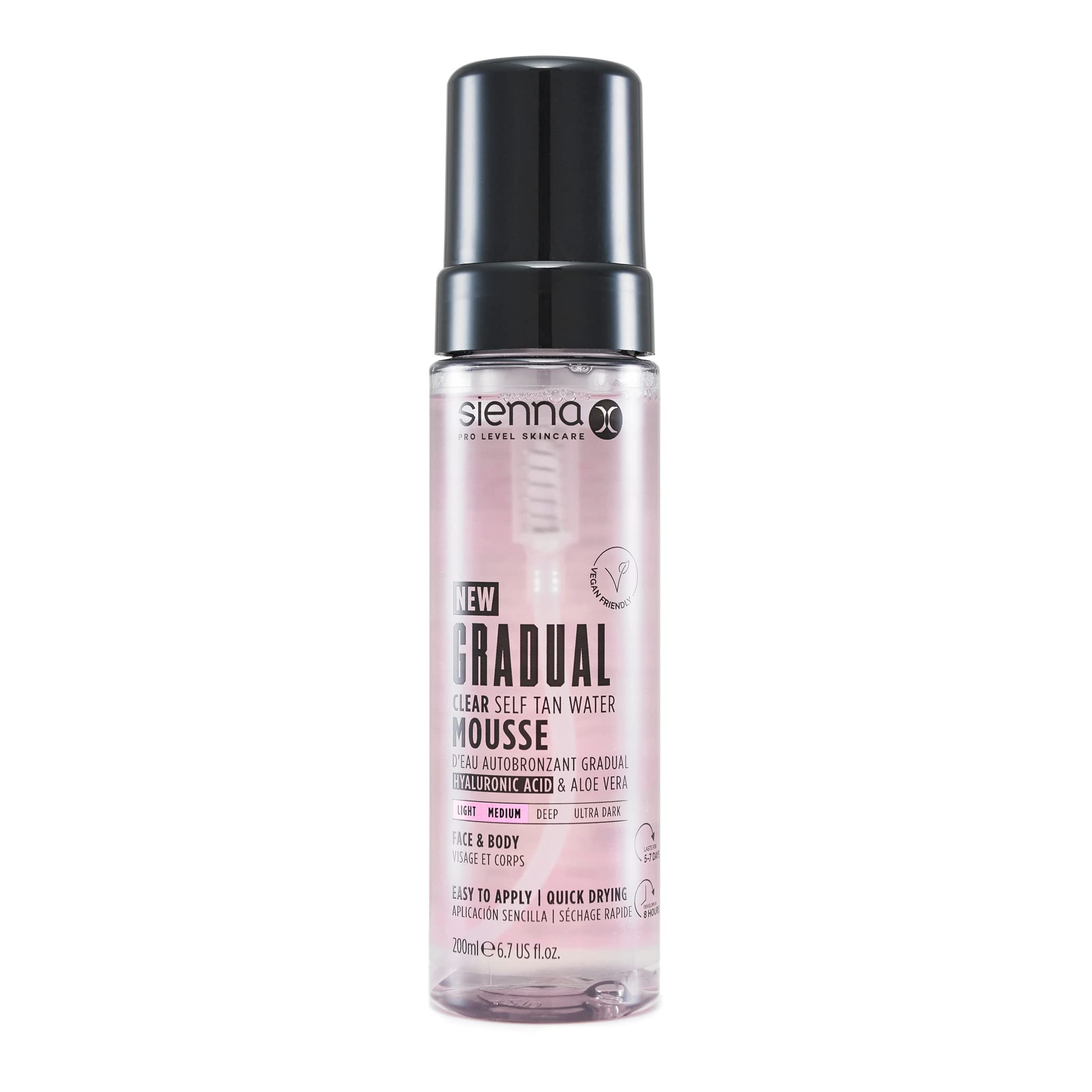 Sienna X Gradual Clear Mousse à l'eau autobronzante végétalienne avec acide hyaluronique et aloe vera 200 ml