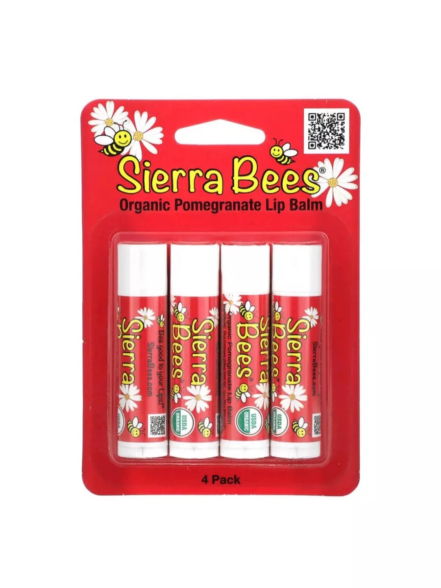 Sierra Bees Organic Lip Balm with Pomegranate features sustainably sourced beeswax, olive oil, sunflower oil, and vitamin E.