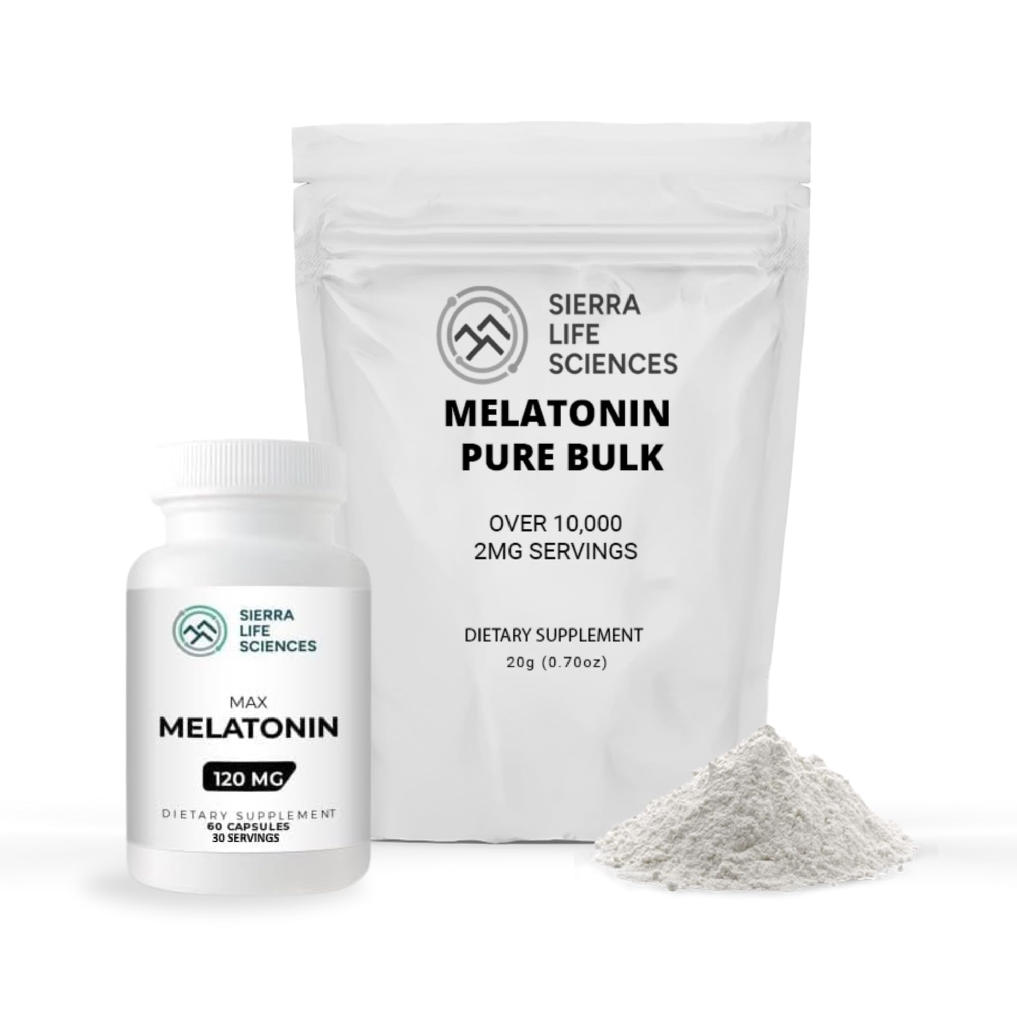 SIERRA LIFE SCIENCES Melatonin Max Bundle | 120mg Capsules & Bulk Powder | Natural Sleep Aid with Custom Dosing | 10 000 Servings Powder + 60 Capsules | High-Dosage Supplement