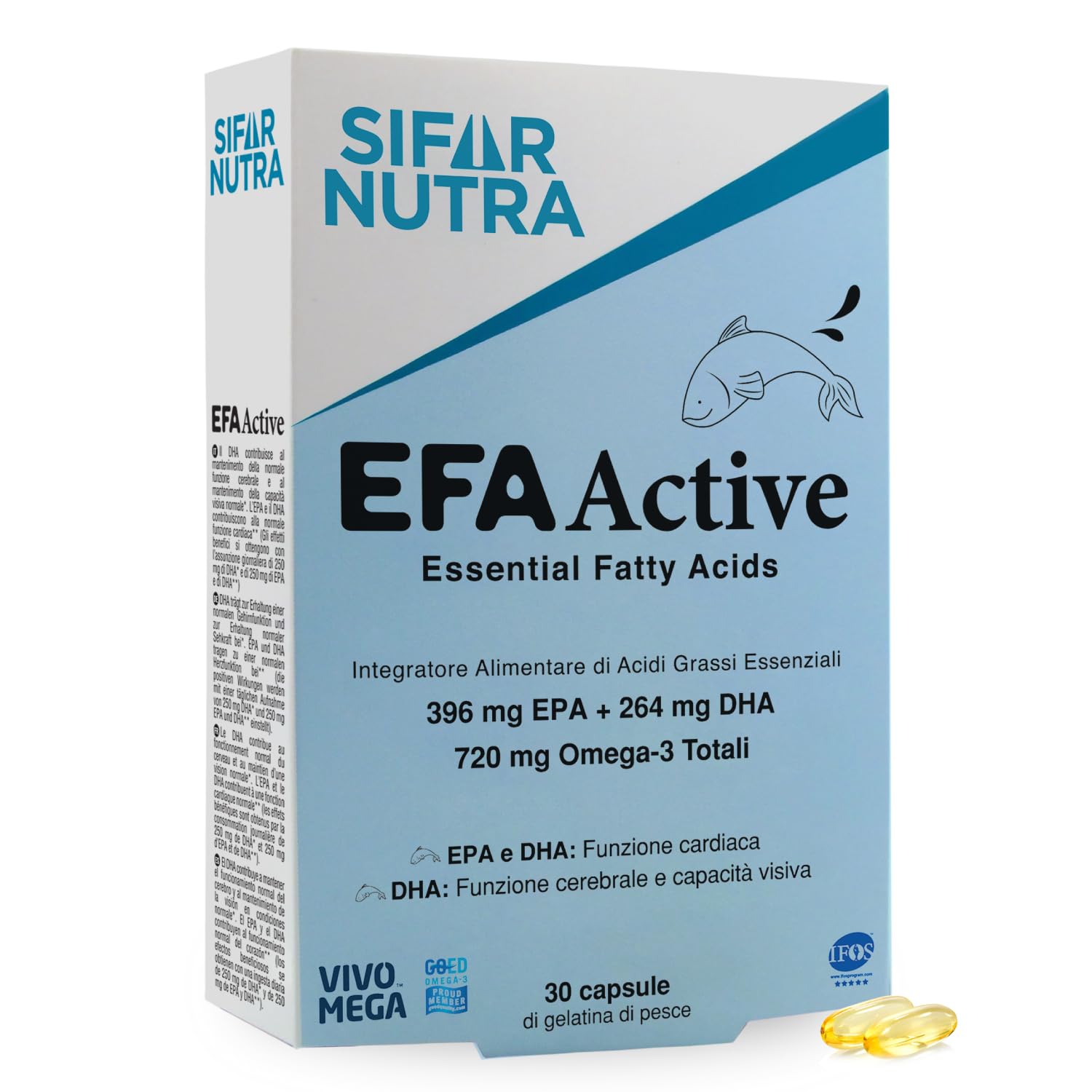 WHY SIFAR NUTRA – Sifar Farma, the innovative pharmaceutical company from the 1960s, returns to Italy under the name Sifar Nutra. Sifar Nutra offers you the most effective supplements and provides you with all the explanations on each product, guaranteeing you complete research. All the products we present on the market under the Sifar Nutra brand are produced in Italy and are included in the Register of Notified Food Supplements of the Ministry of Health. SUSTAINABILITY – Vivomega is certified by Friend of Sea and MarinTrust, the two leading organizations for sustainable and responsible fish management. IFOS 5-STAR CERTIFICATION – EFA Active has obtained the IFOS 5-star certification on each batch. IFOS (International Fish Oil Standards) is Nutrasource's most well-known certification, giving EFA One products an opportunity to control according to the highest quality, safety, and purity standards in the world. BENEFITS - EPA and DHA contribute to normal heart function, DHA contributes to the maintenance of normal brain function and normal vision. EFA ACTIVE OMEGA-3 - The EPA and DHA in EFA Active are 60 in triglyceride form, which ensures faster absorption, giving EFA One greater bioavailability. EFA Active contains 396 mg of EPA and 264 mg of DHA in one capsule, providing the necessary daily dose of Omega-3. EFA Active is gluten and lactose free.POURQUOI SIFAR NUTRA – Sifar Farma, l'entreprise pharmaceutique innovante des années 60, revient en Italie sous le nom de Sifar Nutra. Sifar Nutra vous propose les compléments les plus efficaces et vous fournit toutes les explications sur chaque produit en vous garantissant une recherche complète. Tous les produits que nous présentons sur le marché avec la marque Sifar Nutra sont produits en Italie et figurent au Registre des compléments alimentaires notifiés du Ministère de la Santé. DURABILITÉ - Vivomega est certifié par Friend of Sea et MarinTrust, les deux principales organisations de gestion durable et responsable du poisson. CERTIFICATION IFOS 5 ÉTOILES – EFA Active a obtenu la certification IFOS 5 étoiles sur chaque lot. IFOS (International Fish Oil Standards) est la certification la plus connue de Nutrasource, donnant une opportunité de contrôle aux produits EFA One selon les standards de qualité, de sécurité et de pureté les plus élevés au monde. BÉNÉFICES - L'EPA et le DHA contribuent à une fonction cardiaque normale, le DHA contribue au maintien d'une fonction cérébrale normale et d'une capacité visuelle normale. EFA ACTIVE OMÉGA-3- l'EPA et le DHA contenus dans EFA Active sont à 60 sous forme de triglycérides, ce qui assure une absorption plus rapide, donnant à EFA One une plus grande biodisponibilité. EFA Active contient 396 mg d'EPA et 264 mg de DHA dans une capsule, ce qui permet d'obtenir la dose quotidienne nécessaire d'Oméga-3. EFA Active est sans gluten et sans lactose.