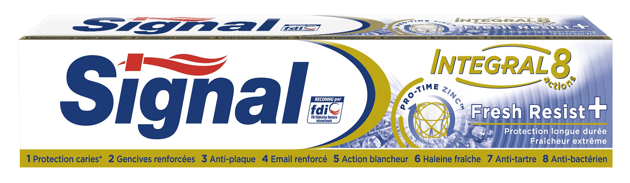 The mineral serum in Signal Integral 8 Fresh Resist toothpaste strengthens teeth by remineralizing tooth enamel. A minty taste for extreme freshness. A complete formula that helps protect your teeth between brushings. Contains an antibacterial formula with Pro-Time Zinc for 18-hour plaque protection. The result: long-lasting protection and 8 effective actions. 1. Helps protect against cavities 2. Strengthens gums 3. Provides up to 18 hours of plaque protection 4. Strengthens enamel 5. Helps restore natural whiteness to teeth 6. Freshens breath 7. Fights tartar buildup 8. Fights bacteria. Signal has been supporting the French since 1961 and is committed to teaching good oral hygiene habits from a young age. Good habits should be adopted by everyone, which is why Signal is committed to demonstrating the importance of brushing twice a day, morning and evening. Furthermore, the brand collaborates closely with numerous experts and is a partner of the French National College of University Dental Surgeons in Public Health. Tips for good oral hygiene: brush your teeth after every meal, change your Signal toothbrush every 2 to 3 months, and see your dentist at least twice a year. Remember to turn off the tap while brushing. INGREDIENTS Aqua, Hydrogenated Starch Hydrolysate, Hydrated Silica, PEG-32, Zinc Citrate, Sodium Lauryl Sulfate, Aroma, Cellulose Gum, Sodium Fluoride, Mica, Sodium Saccharin, Glycerin, Sodium Laureth Sulfate è CI 74160, CI 77891Signal Dentifrice Integral 8 Fresh Resist plus, 75mlDESCRIPTION DU PRODUIT DESCRIPTION DU PRODUIT Le sérum minéral contenu dans le Dentifrice Signal Integral 8 Fresh Resist renforce les dents en reminéralisant l'émail dentaire. Un goût mentholé pour une fraîcheur extrême. Une formule complète qui vous aide à protéger vos dents entre chaque brossage. Contient une formule antibactérienne au Pro-Time Zinc pour une action contre la plaque qui dure 18 heuresLe résultat : une protection longue durée et 8 actions efficaces. 1. Aider à protéger contre les caries2. Renforcer les gencives3. Offrir un effet anti-plaque jusqu'à 18 heures4. Renforcer l'émail5. Aider à retrouver la blancheur naturelle des dents6. Rafraîchir l'haleine7. Combattre la formation du tartre8. Lutter contre les bactériesSignal accompagne les Français depuis 1961 et s'engage pour transmettre les bons gestes d'hygiène bucco-dentaire, et ce dès le plus jeune âge. Les bonnes habitudes doivent être prises par tous, c'est pourquoi Signal s'applique à démontrer l'importance d'un brossage deux fois par jour, matin et soir. De plus, la marque collabore étroitement avec de nombreux experts et est partenaire du Collège National des Chirurgiens-Dentistes Universitaires en Santé Publique. Conseils pour une bonne hygiène bucco-dentaire : brossez-vous les dents après chaque repas, changez de brosse à dents Signal tous les 2 à 3 mois et consultez votre dentiste au moins deux fois par an. Pensez également à couper l'eau pendant le brossage. avec un brossage des dents deux fois par jour. INGRÉDIENTS Aqua, Hydrogenated Starch Hydrolysate, Hydrated Silica, PEG-32, Zinc Citrate, Sodium Lauryl Sulfate, Aroma, Cellulose Gum, Sodium Fluoride, Mica, Sodium Saccharin, Glycerin, Sodium Laureth Sulfate è CI 74160, CI 77891Changez de brosse à dents Signal tous les 2 à 3 mois. Protection caries, gencives renforcées, émail renforcé, action blancheur, haleine fraîche, anti-plaque, anti-tartre et anti-bactérien. Protège vos dents tout au long de la journée et vous apporte 8 actions efficaces contre les problèmes dentaires les plus fréquents. Contient une formule antibactérienne au Pro-Time Zinc pour une action contre la plaque dentaire jusqu'à 18 heures. Une formule avancée qui vous aide à protéger vos dents entre chaque brossage. Le sérum minéral contenu dans Signal Dentifrice Integral 8 Resist renforce les dents en reminéralisant l'émail dentaire.